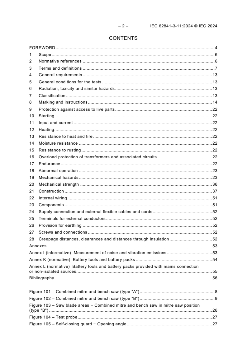 IEC 62841-3-11:2024 is a standard published by the International Electrotechnical Commission (IEC). Its full title is "Electric motor-operated hand-held tools, transportable tools and lawn and garden machinery - Safety - Part 3-11: Particular requirements for transportable combined mitre and bench saws". This standard covers: IEC 62841-3-11:2024 applies to transportable combined mitre and bench saws intended to be used with a toothed saw blade for cutting wood and analogous materials, plastics and nonferrous metals except magnesium with a saw blade diameter not exceeding 315 mm, which hereinafter is simply referred to as saw or tool. This document does not apply to: - saws intended to cut other metals, such as magnesium, steel and iron, or food; - saws with an automatic feeding device; - saws designed for use with abrasive wheels; - saws designed for use with dado blades; - single function bench or table saws; - single function mitre saws; - combined mitre and bench saws other than transportable. NOTE 101 Transportable saws intended to cut ferrous metals will be covered by a future part of IEC 62841-3. NOTE 102 Transportable tools designed for use with abrasive wheels are covered by IEC 62841-3-10:2015. NOTE 103 Transportable table saws are covered by IEC 62841-3-1:2014. NOTE 104 Transportable mitre saws are covered by IEC 62841-3-9:2020. NOTE 105 In Europe (EN IEC 62841-3-11), the following additional NOTE applies: NOTE Z101 Combined mitre and bench saws other than transportable are covered by EN 1870-3:2014. This document is to be used in conjunction with IEC 62841-1:2014. This document supplements or modifies the corresponding clauses in IEC 62841-1, so as to convert it into the IEC Standard: Particular requirements for transportable combined mitre and bench saws.