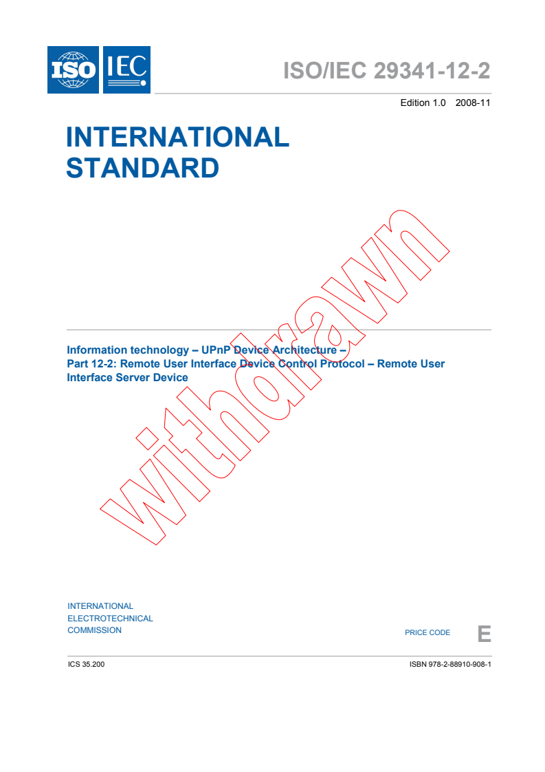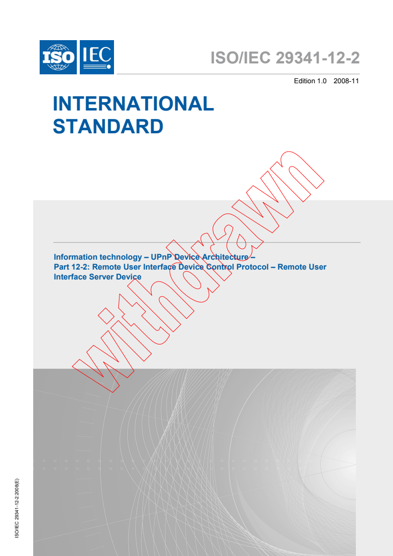 ISO/IEC 29341-12-2:2008 is a standard published by the International Electrotechnical Commission (IEC). Its full title is "Information technology - UPnP Device Architecture - Part 12-2: Remote User Interface Device Control Protocol - Remote User Interface Server Device". This standard covers: ISO/IEC 29341-12-2:2008(E) encapsulates all services for the Remote UI Server Device Control Protocol. The series of ISO/IEC 29341 publications defines an architecture for pervasive peer-to-peer network connectivity of intelligent appliances, wireless devices and PCs. It is designed to bring easy to use, flexible, standards-based connectivity to ad-hoc or unmanaged networks whether in the home, in a small business, public spaces or attached to the Internet.