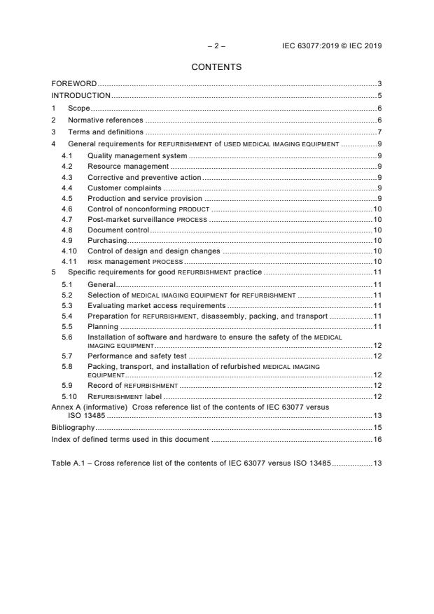 IEC 63077:2019 is a standard published by the International Electrotechnical Commission (IEC). Its full title is "Good refurbishment practices for medical imaging equipment". This standard covers: IEC 63077:2019 describes and defines the PROCESS of REFURBISHMENT of USED MEDICAL IMAGING EQUIPMENT and applies to the restoring of USED MEDICAL IMAGING EQUIPMENT to a condition of safety and performance comparable to that of new MEDICAL IMAGING EQUIPMENT i.e. MEDICAL IMAGING EQUIPMENT that was not in use. This restoration includes actions such as REPAIR, REWORK, software/hardware updates, and the replacement of worn parts with original parts. This document enumerates the actions, that are performed, and the manner consistent, with relevant specifications and service procedures required to ensure that the REFURBISHMENT of MEDICAL IMAGING EQUIPMENT is done without changing the finished MEDICAL IMAGING EQUIPMENT’s performance, safety specifications, or INTENDED USE according to its original or applicable valid registration. The MEDICAL IMAGING EQUIPMENT and systems covered by this document include: – X-RAY EQUIPMENT; – X-RAY EQUIPMENT for RADIOSCOPICALLY GUIDED INTERVENTIONAL PROCEDURES; – X-RAY EQUIPMENT FOR COMPUTED TOMOGRAPHY; – MAGNETIC RESONANCE EQUIPMENT; – ULTRASONIC DIAGNOSTIC EQUIPMENT; – GAMMA CAMERAS; – PLANAR WHOLEBODY IMAGING EQUIPMENT; – equipment for SINGLE PHOTON EMISSION COMPUTED TOMOGRAPHY (SPECT); – SPECT/CT hybrid systems, combining a GAMMA CAMERA with X-RAY EQUIPMENT FOR COMPUTED TOMOGRAPHY (CT); – POSITRON EMISSION TOMOGRAPHS (PET); – PET/CT hybrid systems combining a POSITRON EMISSION TOMOGRAPH with X-RAY EQUIPMENT FOR COMPUTED TOMOGRAPHY (CT); – PET/MRI hybrid systems combining a POSITRON EMISSION TOMOGRAPH with MAGNETIC RESONANCE EQUIPMENT: and – other combinations of the MEDICAL IMAGING EQUIPMENT or systems listed above. This document does not apply to endoscopic equipment, funduscopic equipment, radiation therapy equipment, nor associated systems. IEC 63077:2019 includes the following significant technical changes with respect to IEC PAS 63077:2016: a) the scope was delineated more clearly; b) an informative cross reference list of IEC 63077 vs ISO 13485 (Annex A) was added; c) smaller corrections were performed.