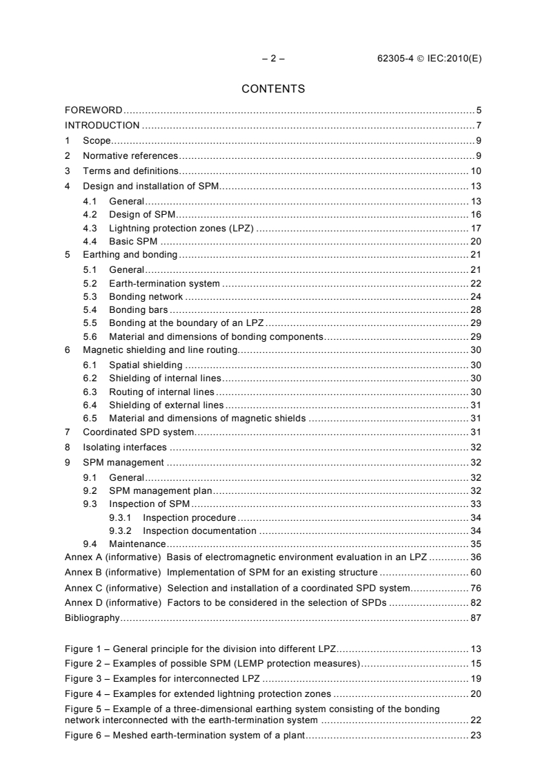 IEC 62305-4:2010 - Protection against lightning: Part 4: Electrical and electronic systems within structures gives guidance for the design, installation, inspection, maintenance and testing of surge protective measures (SPM) to reduce the risk of permanent failures caused by lightning electromagnetic impulse (LEMP) inside buildings and structures. This second edition (2010) updates the 2006 edition and introduces technical changes such as isolating interfaces, revised bonding cross-sections, and improved criteria for surge protective device (SPD) selection.
