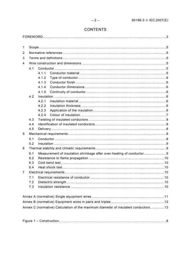 IEC 60189-3:2007 is a standard published by the International Electrotechnical Commission (IEC). Its full title is "Low-frequency cables and wires with PVC insulation and PVC sheath - Part 3: Equipment wires with solid or stranded conductor wires, PVC insulated, in singles, pairs and triples". This standard covers: is applicable to equipment wires with solid or stranded conductor, polyvinyl chloride (PVC) insulated, in singles, pairs and triples to be used for internal wiring of telecommunication equipment, industrial and consumer electronic equipment.
