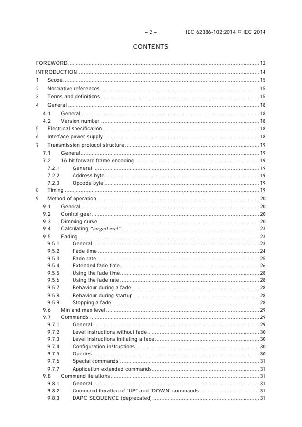 IEC 62386-102:2014 is a standard published by the International Electrotechnical Commission (IEC). Its full title is "Digital addressable lighting interface - Part 102: General requirements - Control gear". This standard covers: IEC 62386-102:2014 is applicable to control gear in a bus system for control by digital signals of electronic lighting equipment. This electronic lighting equipment should be in line with the requirments of IEC 61347, with the addition of d.c. supplies. This second edition cancels and replaces the first edition published in 2009. This edition constitutes a technical revision. This edition includes the following significant technical changes with respect to the previous edition: a) elimination of all non-control gear relevant definitions, b) improvement of the requirements for control gear by clarifying the description, c) improvement of the test command iterations to increase the compatibility, d) addition of new commands, and e) the deletion of the requirements for: 1) timing; 2) control devices. The requirements for timing are now in Part 101 and the requirments for control devices are in Part 103. This publication is to be read in conjunction with IEC 62386-101:2014