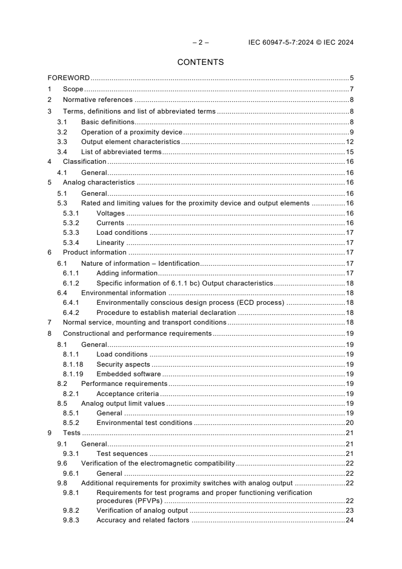 IEC 60947-5-7:2024 states the requirements for proximity devices that correspond to the scope of IEC 60947-5-2:2019 with analog output (PDAO) and/or a digital output to transmit a corresponding digital value representing the detected sensing input. These devices can provide additional parameters. This second edition cancels and replaces the first edition published in 2003. This edition constitutes a technical revision. This edition includes the following significant technical changes with respect to the previous edition: a) New structure; b) Update and expansion of definitions on analog output properties; c) Expanded performance requirements on analog output; d) Update and new normative references; e) Update of EMC requirements; f) Harmonization with IEC 62828 series; g) Harmonization with IEC 62683 and IEC 61987 definitions; h) Harmonization with IEC 61131-2 requirements; i) Update of the Annex A (former Annex G), Example of the determination of the conformity; j) New Annex B, Overview tests and influence quantities; k) New Annex C, Additional requirements for proximity switches with analog output incorporating a built-in communication interface complying with IEC 61131-9; l) New Annex D, Main characteristics for proximity devices with analog output.