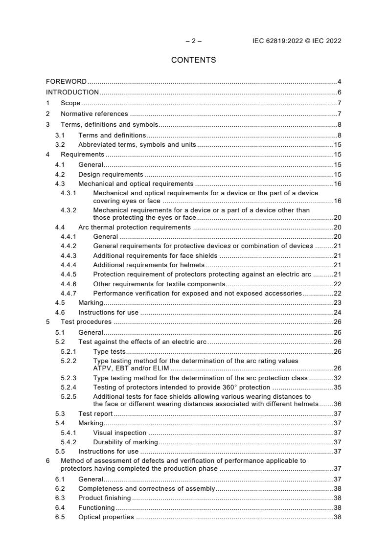 IEC 62819:2022 is applicable to eye, face and head protectors used in work where there is a risk of exposure to an electric arc hazard. Such protectors consist of one or several devices (e.g. hood, goggles, balaclavas, face shields, helmets, etc.), which might need to be combined together in order to give protection to eye, face and head for the intended use. This document covers the performance requirements for protectors and single protective devices considering thermal, optical and mechanical hazards of an electric arc. The product covered by this document can have an impact on the environment during some or all stages of its life cycle. These impacts can range from slight to significant, be short-term or long-term, and occur at the global, regional or local level. This document does not include requirements and test provisions for the manufacturers of the product or recommendations to the users of the product for environmental improvement. However, all parties intervening in its design, manufacture, packaging, distribution, use, maintenance, repair, reuse, recovery and disposal are invited to take account of environmental considerations. Products designed and manufactured in accordance with this document contribute to the safety of the users provided they are used by skilled persons, in accordance with safe methods of work and the instructions for use. The contents of the corrigendum of March 2024 have been included in this copy.