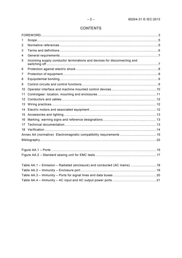 IEC 60204-31:2013 is a standard published by the International Electrotechnical Commission (IEC). Its full title is "Safety of machinery - Electrical equipment of machines - Part 31: Particular safety and EMC requirements for sewing machines, units and systems". This standard covers: IEC 60204-31:2013 applies to electrical and electronic equipment, sewing machines, units and systems, designed specifically for professional use in the sewing industry. It is applicable to the electrical equipment or parts of the electrical equipment which operate with nominal supply voltages not exceeding 1 000 V for alternating current and not exceeding 1 500 V for direct current, and with nominal frequencies not exceeding 200 Hz. This fourth edition cancels and replaces the third edition, published in 2001 and constitutes a technical revision. It includes the following changes: - Alignment of the normative references; - Alignment of titles and subtitles to the IEC 60204-1; - Revision of Annex AA to align this annex with the relevant IEC standards. This publication is to be read in conjunction with IEC 60204-1:2009.