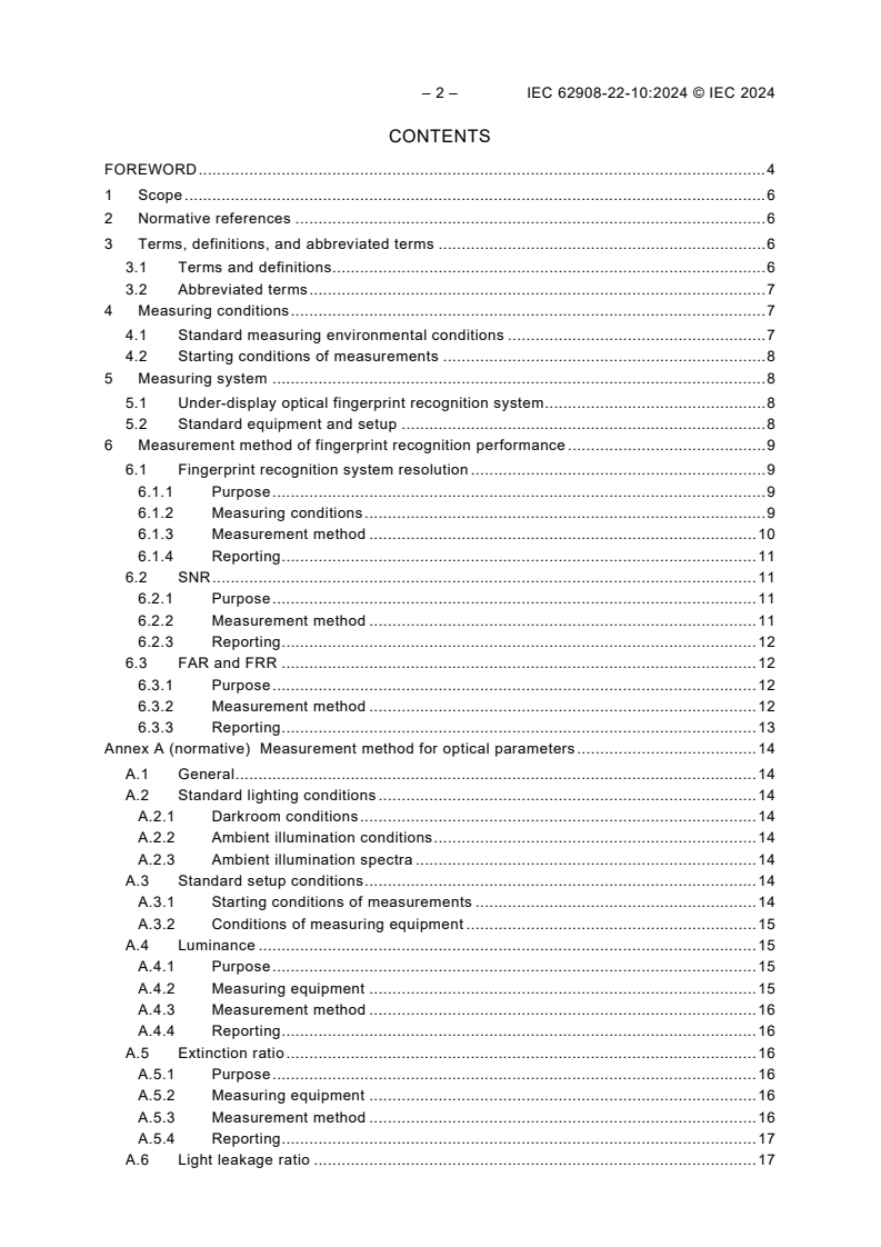 IEC 62908-22-10:2024 specifies the standard measuring conditions and measurement methods for determining the performance of fingerprint recognition systems with under-display optical imaging fingerprint sensing. This document is applicable to use displays as illumination sources of optical imaging fingerprint sensing.