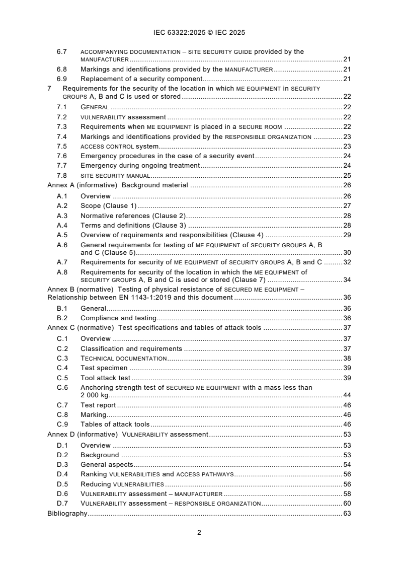 IEC 63322:2025 is a standard published by the International Electrotechnical Commission (IEC). Its full title is "Security of ME equipment containing high-activity sealed radioactive sources". This standard covers: IEC 63322:2025 establishes security requirements of ME EQUIPMENT using high-activity SEALED RADIOACTIVE SOURCES, directly or indirectly, for medical treatment and other clinical procedures. ME EQUIPMENT containing SEALED RADIOACTIVE SOURCES that are defined as Category 1, 2 and 3 RADIOACTIVE SOURCES by IAEA are subject to this document. The object of this document is to specify requirements for the security of ME EQUIPMENT containing high-activity SEALED RADIOACTIVE SOURCES with the aim to minimize the risk of unauthorized access to the contained SEALED RADIOACTIVE SOURCES, and to serve as the basis for other standards. This document contains requirements for the MANUFACTURER of the ME EQUIPMENT and, separately, for the RESPONSIBLE ORGANIZATION regarding security at the location during use and storage. The requirements of this document apply when the SEALED RADIOACTIVE SOURCES are contained in the ME EQUIPMENT, i.e. from the time when the SEALED RADIOACTIVE SOURCES are inserted into the ME EQUIPMENT, during the INTENDED USE and when the ME EQUIPMENT is not being used for its INTENDED USE or taken out of regular use, until the equipment is being decommissioned, i.e. until all SEALED RADIOACTIVE SOURCES are permanently removed from the equipment.