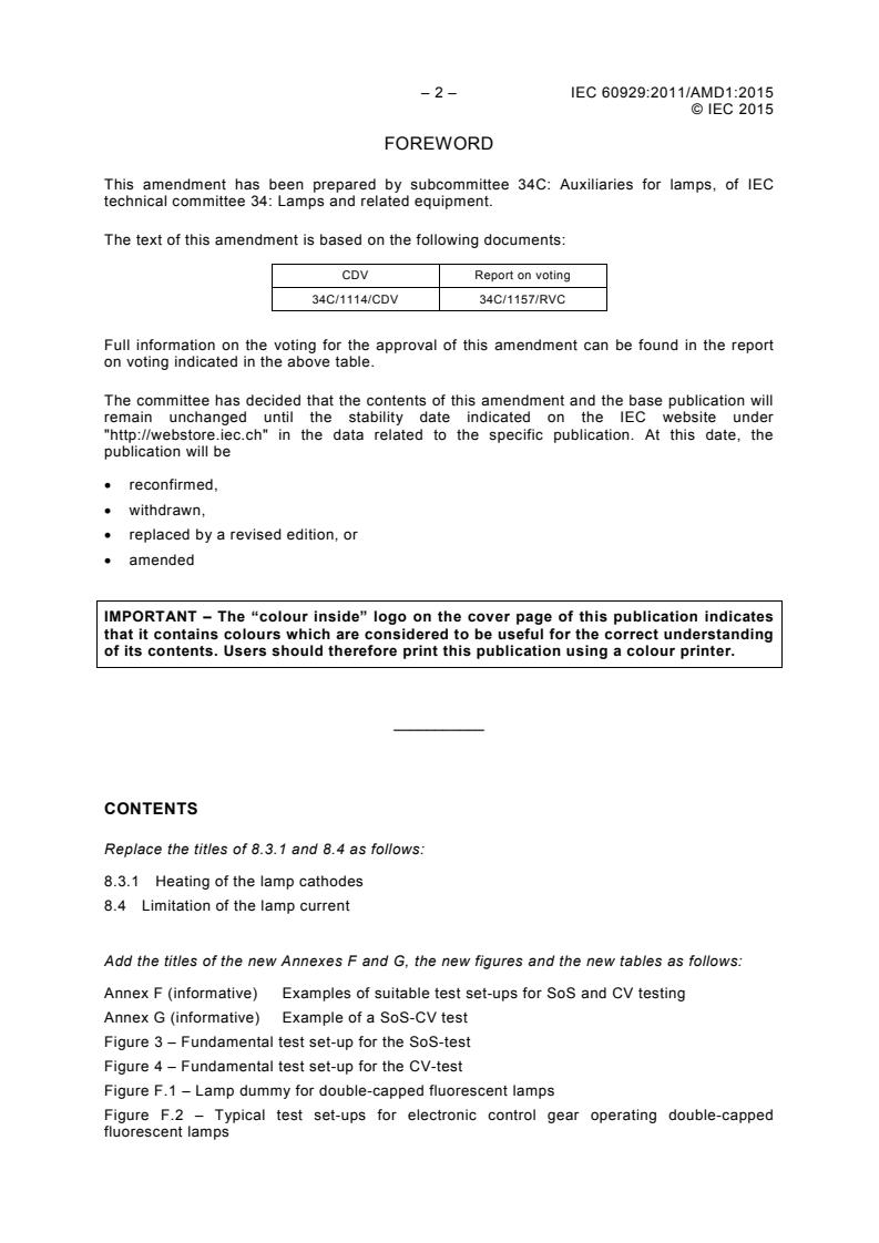 This amendment addresses critical aspects such as dimming performance, cathode heating requirements, and testing methodologies to ensure consistent lamp function and longevity. It supports manufacturers, designers, and testing laboratories involved in the development and validation of control gear used in fluorescent lighting systems.