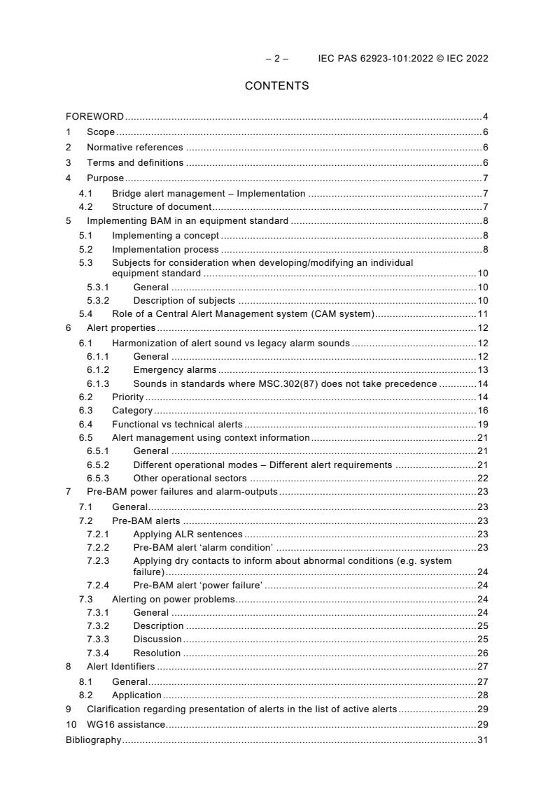 IEC PAS 62923-101:2022 primarily provides support to other workgroups to include alert requirements in standards in line with Bridge Alert Management (BAM), and additionally provides support to designers to implement alert properties so that they conform with the BAM requirements. This document is applicable, and is intended to provide guidance, when the intention is to implement BAM according to IMO Resolution MSC.302(87). Based on the IMO decision to adopt the BAM Performance Standard MSC.302(87) as a high level leading umbrella standard for intended implementation of BAM, IMO resolved in MSC.302(87), 3.6, that in case of conflict with alert requirements in existing performance standards, MSC.302(87) takes precedence.
