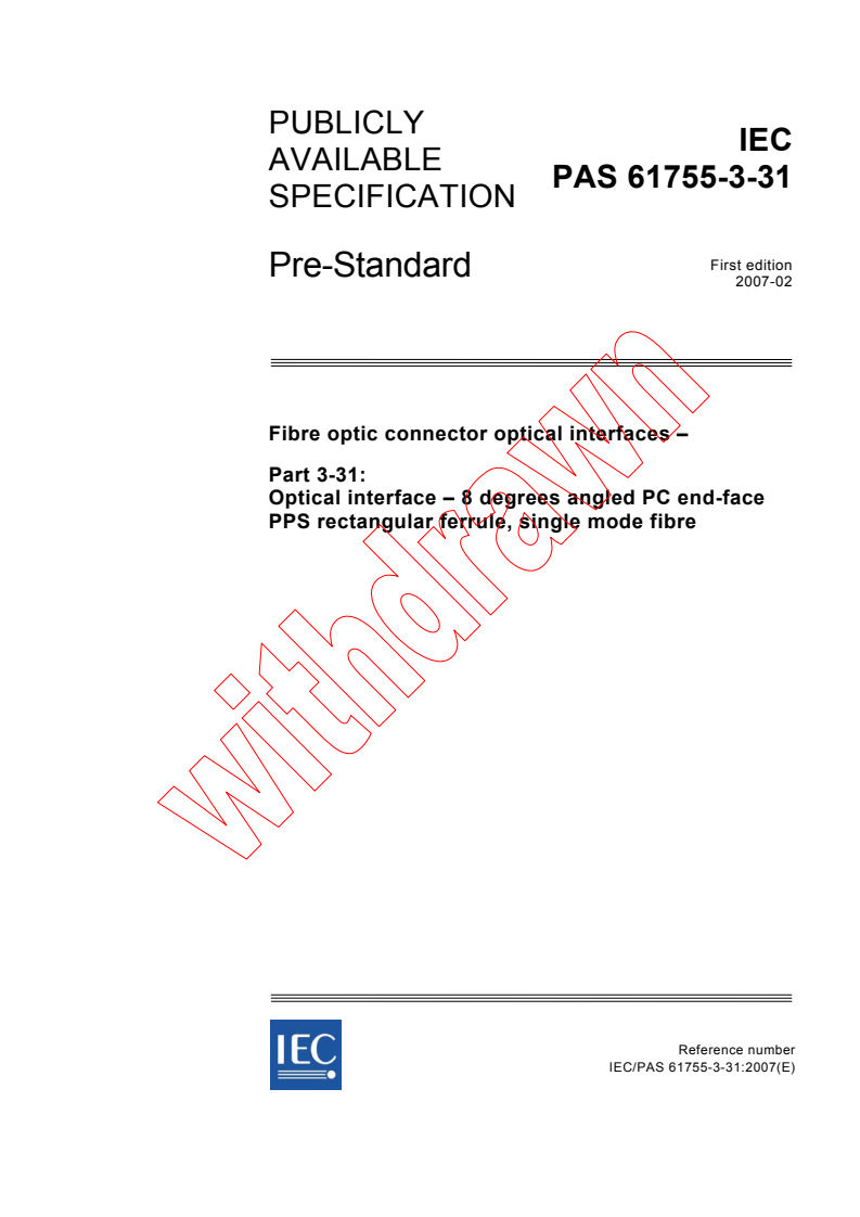 IEC PAS 61755-3-31:2007 - Fibre optic connector optical interfaces - Part 3-31: Optical interface - 8 degrees angled PC end-face PPS rectangular ferrule, single mode fibre Released:2/16/2007