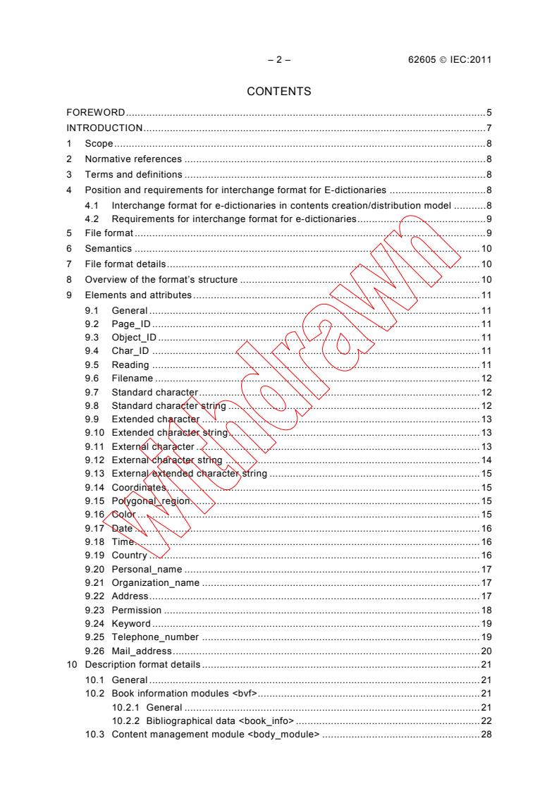 IEC 62605:2011 specifies the interchange format for e-dictionaries among publishers, content creators and manufacturers. It does not address the following aspects: - data formats for reading devices; - elements necessary for final print reproduction only; - rendering issues related to physical devices; - security issues such as DRM for document.