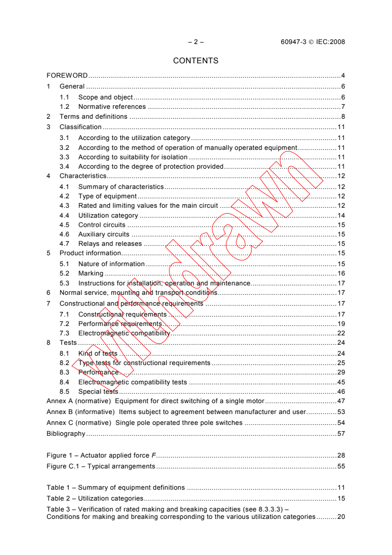 IEC 60947-3:2008 applies to switches, disconnectors, switch-disconnectors and fuse-combination units to be used in distribution circuits and motor circuits of which the rated voltage does not exceed 1 000 V a.c. or 1 500 V d.c. This part does not apply to equipment coming within the scope of IEC 60947-2, IEC 60947-4-1 and IEC 60947-5-1; however, when switches and fuse-combination units coming into the scope of this part are normally used to start, accelerate and/or stop an individual motor they shall also comply with the additional requirements given in Annex A. The requirements for single pole operated three pole switches are included in Annex C. Auxiliary switches fitted to equipment within the scope of this part shall comply with the requirements of IEC 60947-5-1. This part does not include the additional requirements necessary for electrical apparatus for explosive gas atmospheres. This edition includes the following significant technical changes with respect to the previous edition: - alignment with the fifth edition of IEC 60947-1; - a switching operation without current allowed between making and breaking operation (Table 3); - increased number of operations for AC-23 allowed with agreement of the manufacturer (Table 3); - simplified test procedure amended, f) added to 8.3.2.1.3; - temperature rise test shall be made at the rated operational current /e instead of the conventional enclosed thermal current /the (8.3.3.1).