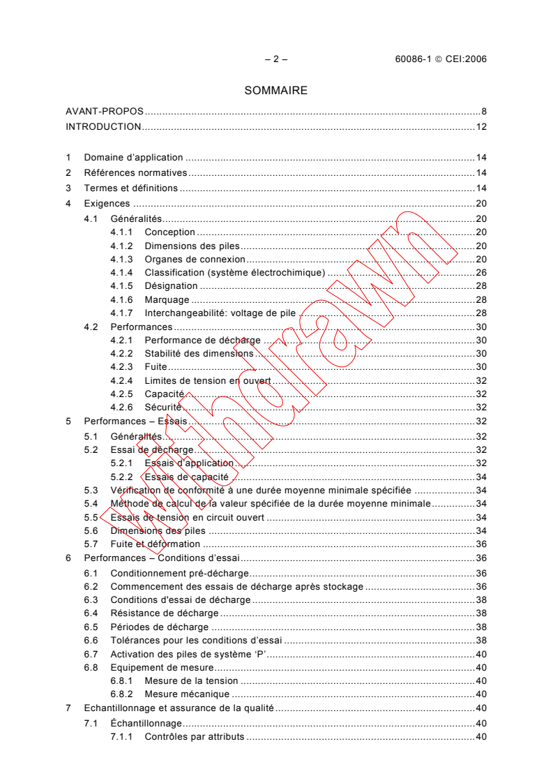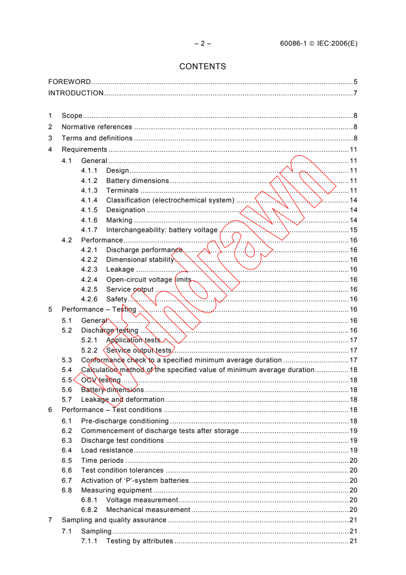 - Performance and test methods: discharge testing, open-circuit voltage, service output, leakage and deformation tests (Clauses 5–6).