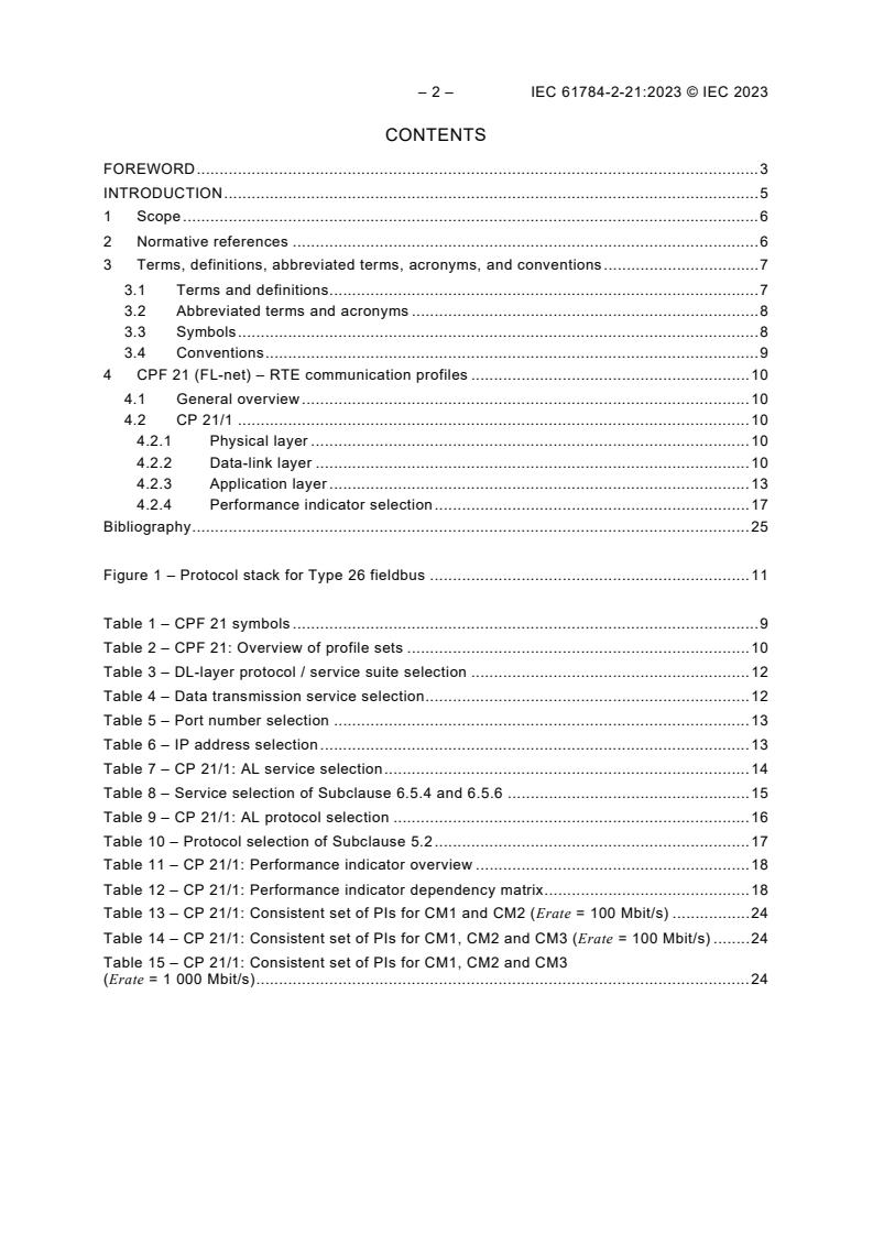 IEC 61784-2-21:2023 defines Communication Profile Family 21 (CPF 21). CPF 21 specifies a Real-Time Ethernet (RTE) communication profile (CP) and related network components based on the IEC 61158 series (Type 26), ISO/IEC/IEEE 8802‑3 and other standards. For each RTE communication profile, this document also specifies the relevant RTE performance indicators and the dependencies between these RTE performance indicators. NOTE 1 All CPs are based on standards or draft standards or International Standards published by the IEC or on standards or International Standards established by other standards bodies or open standards processes. NOTE 2 The RTE communication profile uses ISO/IEC/IEEE 8802‑3 communication networks and its related network components and in some cases amend those standards to obtain RTE features.