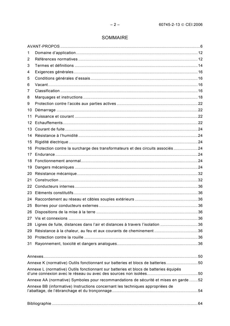 IEC 60745-2-13:2006 is an international standard published by the International Electrotechnical Commission (IEC) that specifies safety requirements for hand-held motor-operated electric tools, specifically focusing on chain saws used for cutting wood by a single operator. This standard excludes chain saws designed for use with guide-plates and riving knives, as well as chain saws used in tree service, pole cutters, and pruners covered under ISO 11681-2.