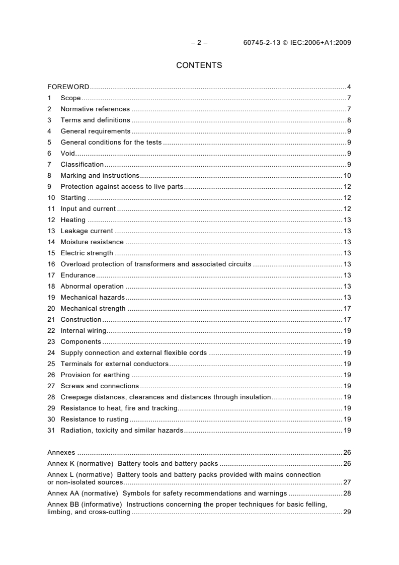 IEC 60745-2-13:2006 is a standard published by the International Electrotechnical Commission (IEC). Its full title is "Hand-held motor-operated electric tools - Safety - Part 2-13: Particular requirements for chain saws". This standard covers: Applies to chain saws for cutting wood and designed for use by one person. This standard does not cover chain saws designed for use in conjunction with a guide-plate and riving knife or in any other way such as with a support or as a stationary or transportable machine. Does not apply to chain saws for tree service as defined in ISO 11681-2, pole cutters and pruners.