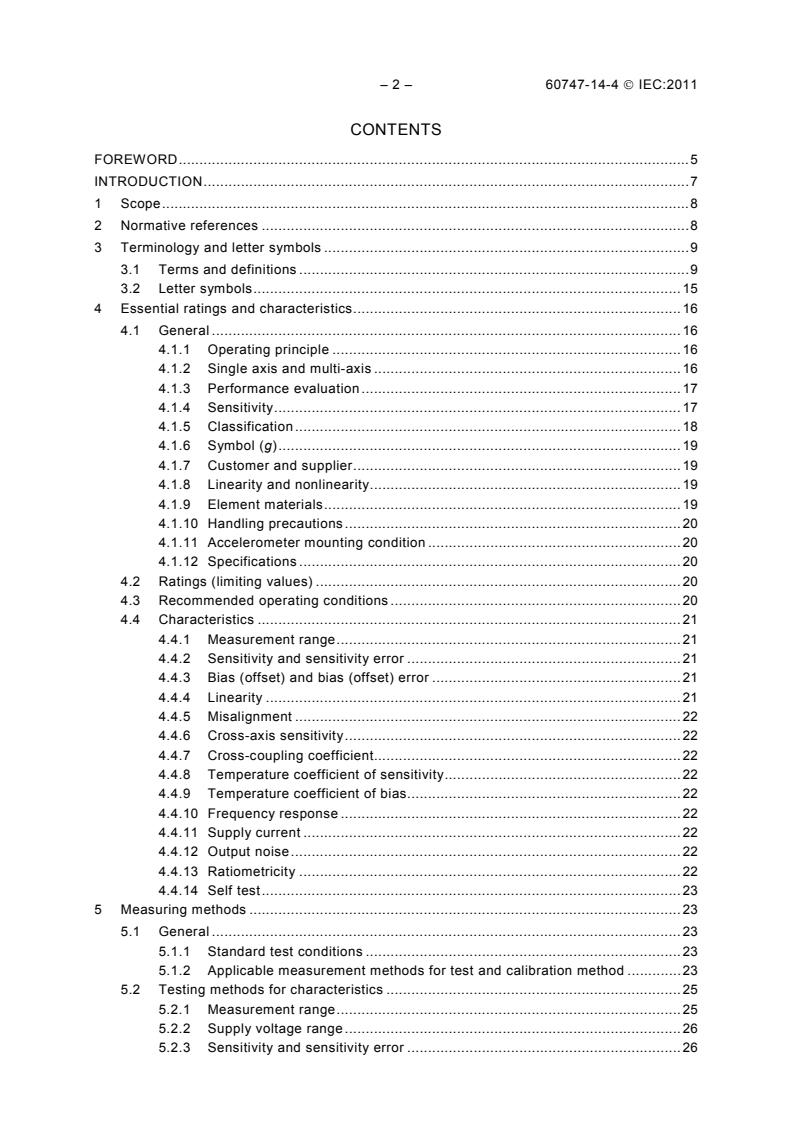 IEC 60747-14-4:2011 applies to semiconductor accelerometers for all types of products. This standard applies not only to typical semiconductor accelerometers with built-in electric circuits, but also to semiconductor accelerometers accompanied by external circuits. This standard does not (or should not) violate (or interfere with) the agreement between customers and suppliers in terms of a new model or parameters for business.