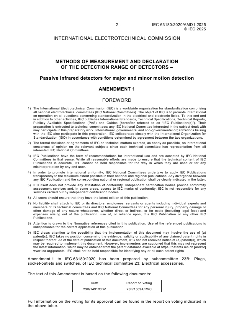 IEC 63180:2020/AMD1:2025 is a standard published by the International Electrotechnical Commission (IEC). Its full title is "Amendment 1 - Methods of measurement and declaration of the detection range of detectors - Passive infrared detectors for major and minor motion detection". This standard covers: Amendment 1 - Methods of measurement and declaration of the detection range of detectors - Passive infrared detectors for major and minor motion detection