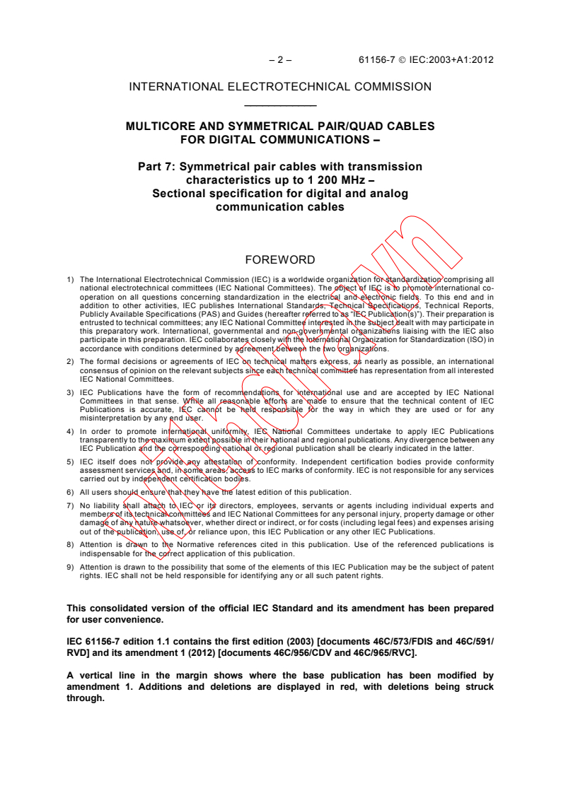 IEC 61156-7:2003+AMD1:2012 CSV - Multicore and symmetrical pair/quad cables for digital communications - Part 7: Symmetrical pair cables with transmissioncharacteristics up to 1 200 MHz - Sectional specification fordigital and analog communication cables Released:12/7/2012 Isbn:9782832205631