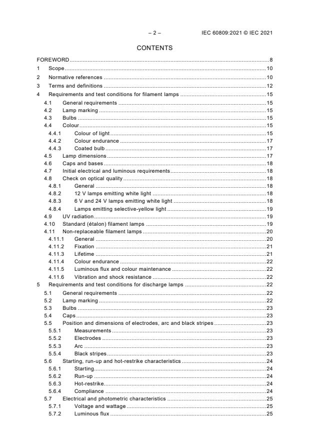 - Filament lamps: dimensional, marking, colour, bulb shape, caps/bases, electrical and photometric tests (includes sections for 6 V, 12 V and 24 V filament lamps).