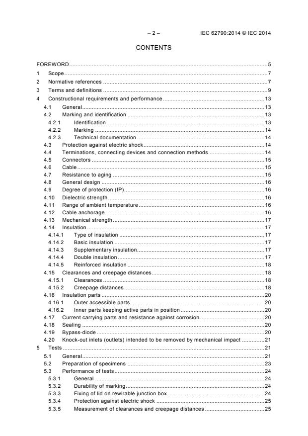 IEC 62790:2014 describes safety requirements, constructional requirements and tests for junction boxes up to 1 500 V dc for use on photovoltaic modules according to class II of IEC 61140:2001. This standard applies also to enclosures mounted on PV-modules containing electronic circuits for converting, controlling, monitoring or similar operations.