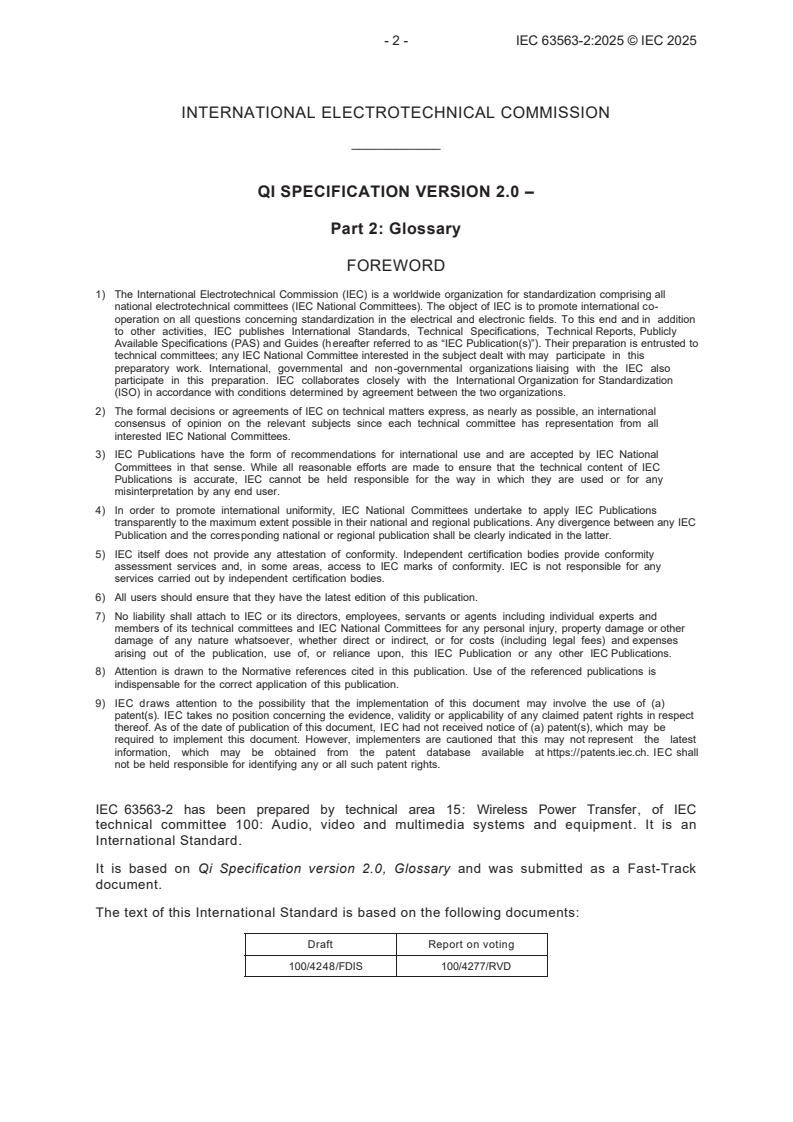 Keywords: IEC 63563-2:2025, Qi Specification version 2.0, glossary, wireless charging, wireless power, 15 W, definitions, acronyms, symbols, Power Transmitter, Power Receiver, FOD, authentication, certificate chain, WPID.