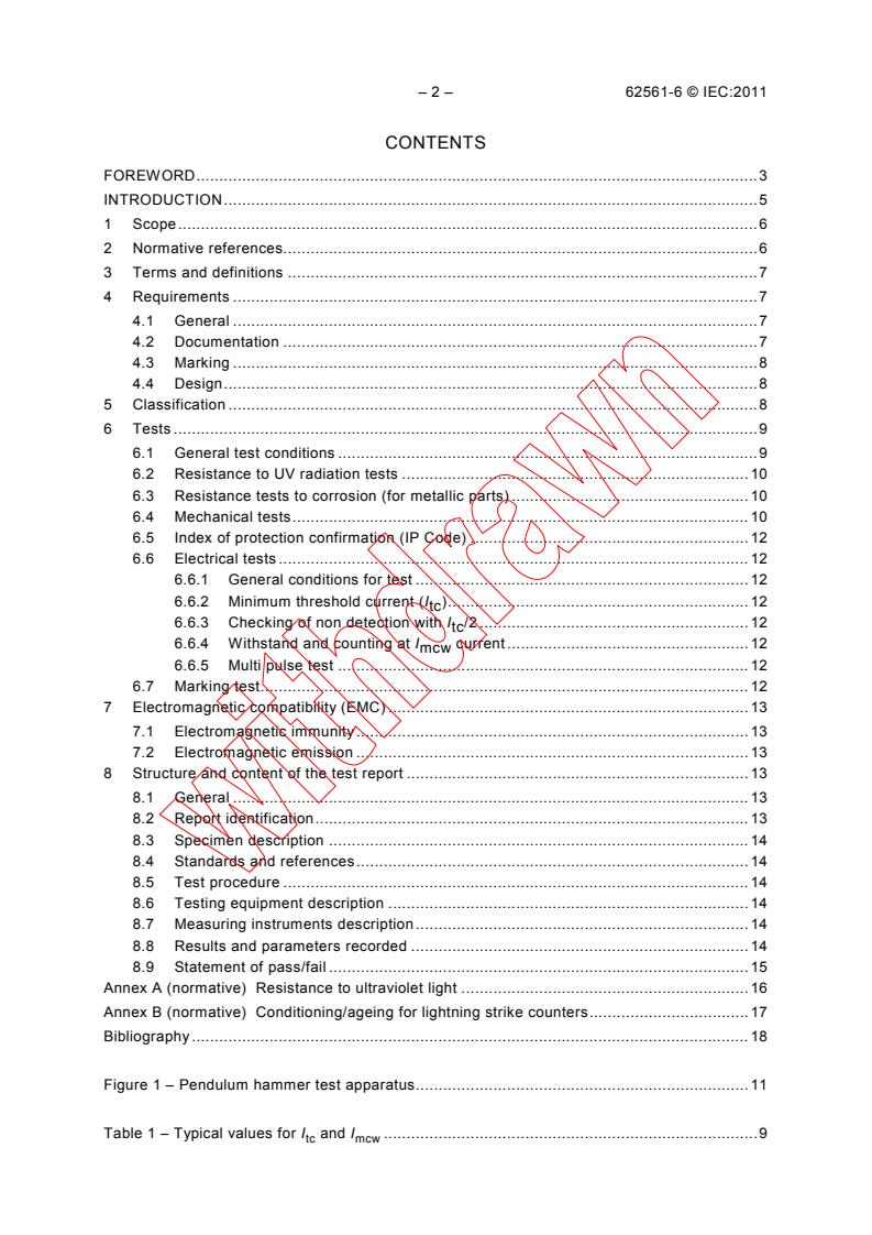 IEC 62561-6:2011 specifies the requirements and tests for devices intended to count the number of lightning strike pulses flowing in a conductor. This conductor may be part of a lightning protection system (LPS) or connected to an SPD installation (or other conductors which are not intended to conduct a significant portion of lightning currents).