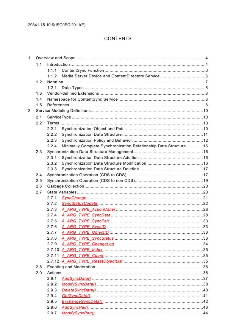 ISO/IEC 29341-15-10:2011 defines the Content Synchronization (ContentSync or CSS) service as part of the UPnP Device Architecture. The standard describes how two or more UPnP ContentDirectory Services (CDS)-or a control point and a CDS-synchronize content objects and resources. It is compliant with UPnP Device Architecture v1.0 and is intended for implementations that need reliable, interoperable content replication and update propagation across networked media servers.