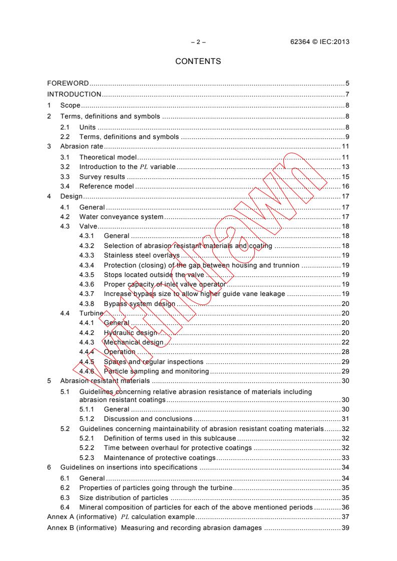 IEC 62364:2013 serves to present data on particle abrasion rates on several combinations of water quality, operating conditions, component materials, and component properties collected from a variety of hydro sites; develop guidelines for the methods of minimizing particle abrasion by modifications to hydraulic design for clean water. These guidelines do not include: