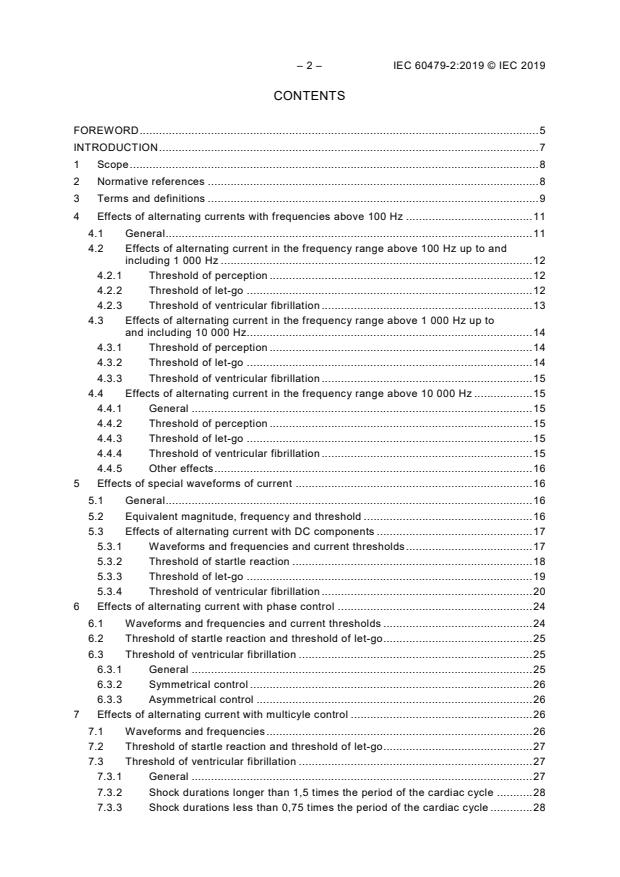 IEC 60479-2:2019 is a standard published by the International Electrotechnical Commission (IEC). Its full title is "Effects of current on human beings and livestock - Part 2: Special aspects". This standard covers: IEC 60479-2:2019 describes the effects on the human body when a sinusoidal alternating current in the frequency range above 100 Hz passes through it. The effects of current passing through the human body for: – alternating sinusoidal current with DC components, – alternating sinusoidal current with phase control, and – alternating sinusoidal current with multicycle control are given but are only deemed applicable for alternating current frequencies from 15 Hz up to 100 Hz. Means of extending the frequency of applicability of pure sinusoids to a frequency of 150 kHz are given and means of examining random complex irregular waveforms are given. This document describes the effects of current passing through the human body in the form of single and multiple successive unidirectional rectangular impulses, sinusoidal impulses and impulses resulting from capacitor discharges. The values specified are deemed to be applicable for impulse durations from 0,1 ms up to and including 10 ms. This document only considers conducted current resulting from the direct application of a source of current to the body, as does IEC 60479-1. It does not consider current induced within the body caused by its exposure to an external electromagnetic field. This basic safety publication is primarily intended for use by technical committees in the preparation of standards in accordance with the principles laid down in IEC Guide 104 and ISO/IEC Guide 51. It is not intended for use by manufacturers or certification bodies. One of the responsibilities of a technical committee is, wherever applicable, to make use of basic safety publications in the preparation of its publications. The requirements, test methods or test conditions of this basic safety publication will not apply unless specifically referred to or included in the relevant publications. This first edition cancels and replaces IEC TS 60479-2:2017. This edition constitutes a technical revision. This edition includes the following significant technical changes with respect to IEC TS 60479 2:2017: a) change in status from Technical Specification to International Standard.