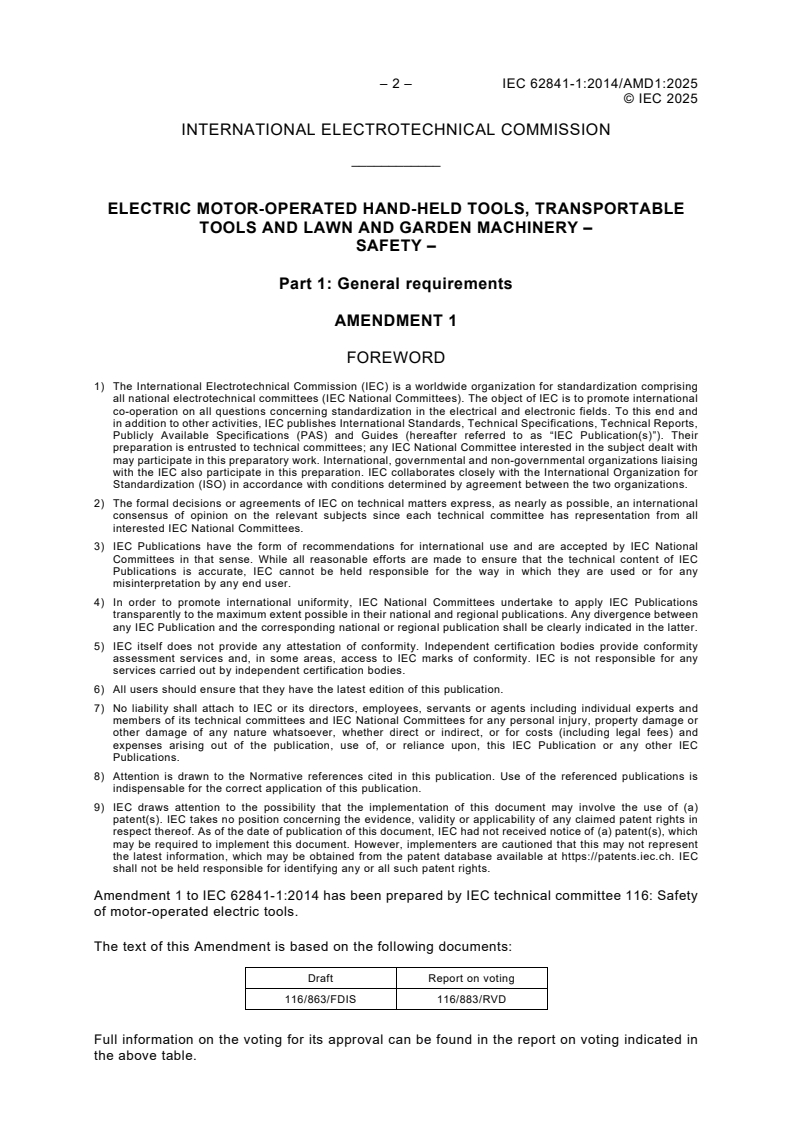 IEC 62841-1:2014/AMD1:2025 is a standard published by the International Electrotechnical Commission (IEC). Its full title is "Amendment 1 - Electric motor-operated hand-held tools, transportable tools and lawn and garden machinery - Safety - Part 1: General requirements". This standard covers: IEC 62841-1:2024 Amendment 1