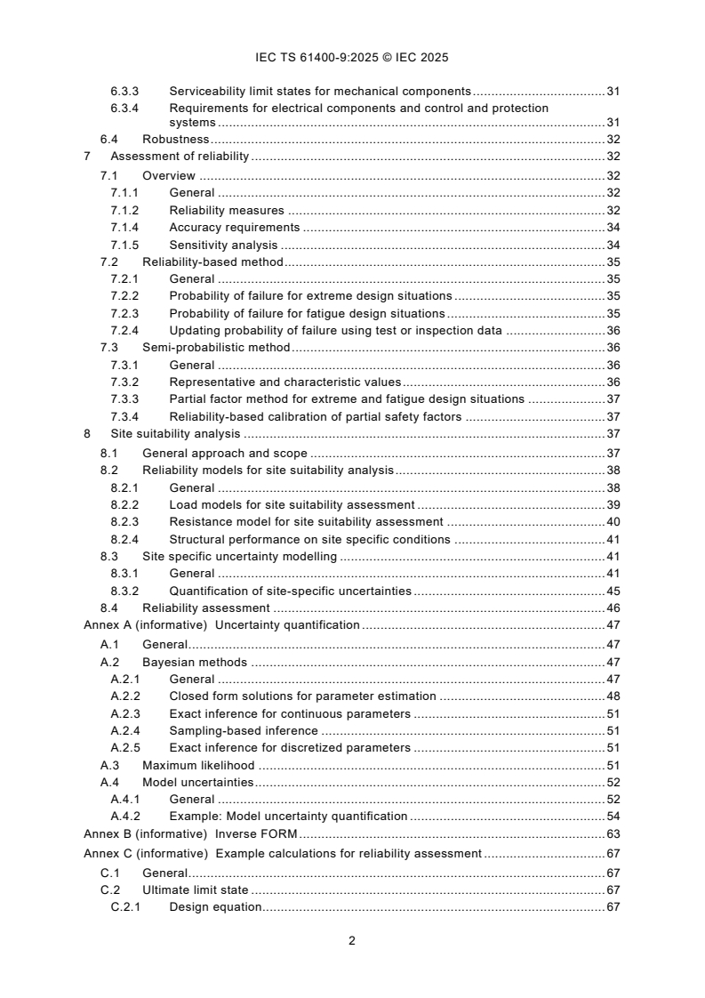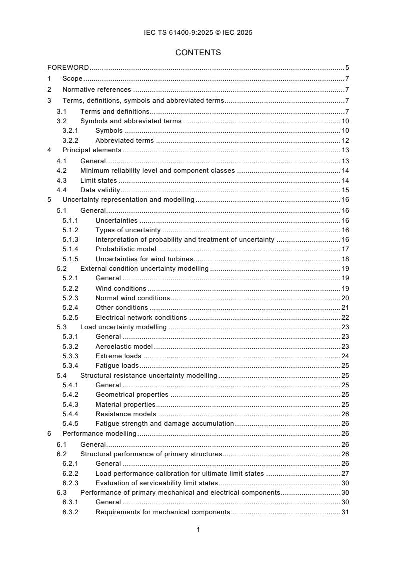 IEC TS 61400-9:2025 sets out minimum requirements to the use of probabilistic design measures in order to ensure the structural and mechanical integrity of wind turbines. The document is based on the general approach in ISO 2394, which also forms the basis for IEC 61400-1. In 61400-1, the design verification approach is based on deterministic design using safety factors. However, edition 4 of IEC 61400-1:2019 opens for introduction of probabilistic design in an informative annex specifying requirements to the calibration of structural material safety factors and structural design assisted by testing. IEC 61400-1 is the governing standard. This document provides appropriate methodologies and requirements for full probabilistic design by taking into account specific uncertainties on not only material properties but also on environmental conditions, design models and the degree of validation. This document also provides provisions for semi-probabilistic design, including reliability-based calibration of partial safety factors and assessment of existing wind turbines. The probabilistic methods in this document are formulated generically and can be applied to structural and mechanical failure modes where a limit state equation can be formulated.