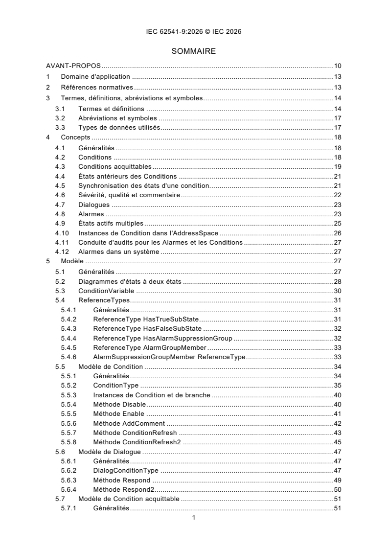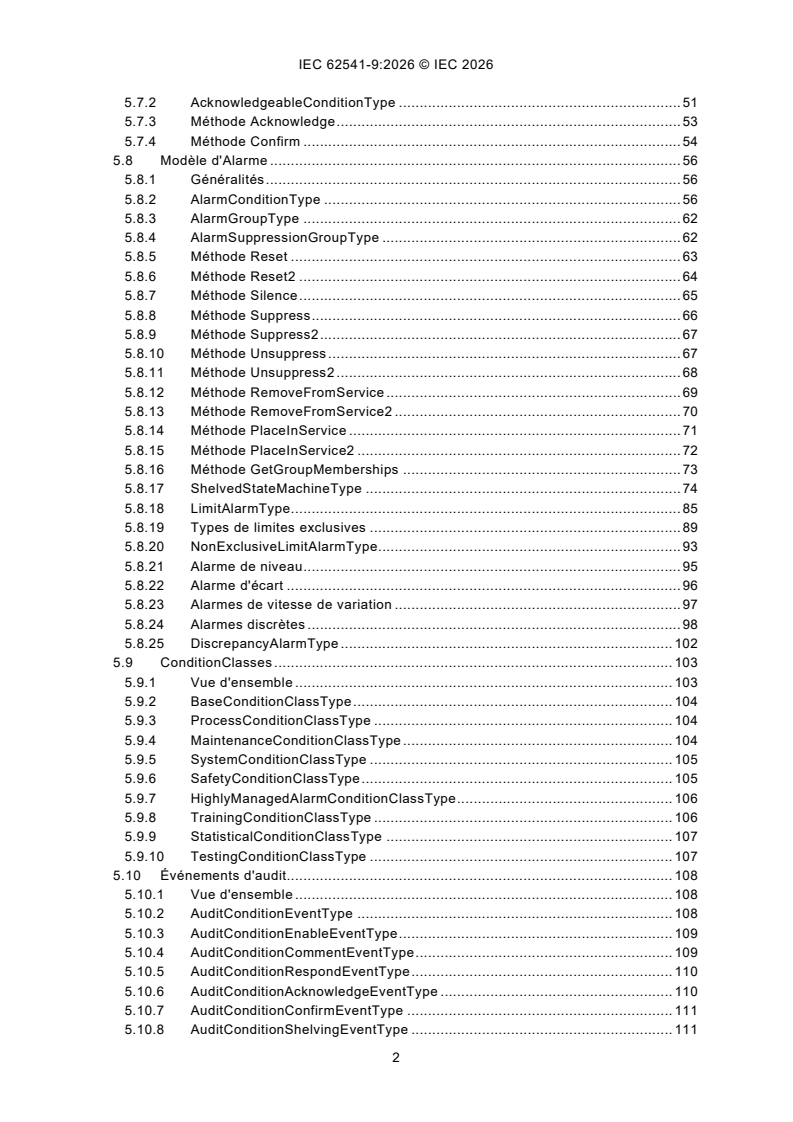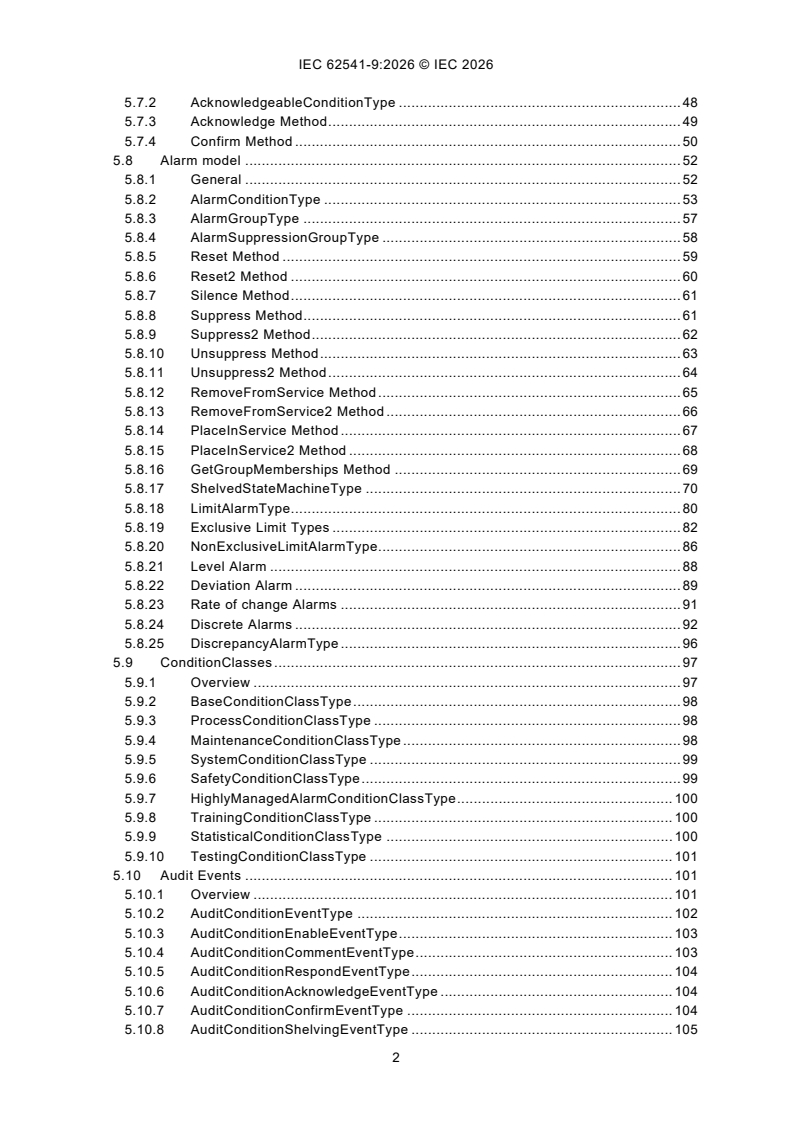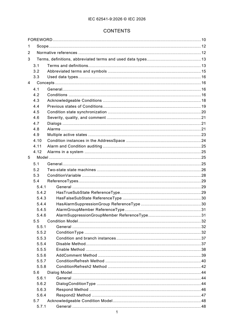 IEC 62541-9:2026 specifies the representation of Alarms and Conditions in the OPC Unified Architecture. Included is the Information Model representation of Alarms and Conditions in the OPC UA address space. Other aspects of alarm systems like alarm philosophy, life cycle, alarm response times, alarm types and many other details are captured in standards such as IEC 62682 and ISA 18.2. The Alarms and Conditions Information Model in this document, is designed in accordance with IEC 62682 and ISA 18.2. Annex C specifies a recommended mapping between OPC Classic Alarm & Events (A&E) servers to the model described in this document. Annex A describes recommended localized names for Alarm states. Annex B describes examples (e.g. Event sequences, Alarm areas in AddressSpace). This fourth edition cancels and replaces the third edition published in 2020. This edition constitutes a technical revision. This edition includes the following significant technical changes with respect to the previous edition: a) addition of "Comment" parameter to Alarm shelving methods; b) addition of method that allows a client to get the members of a group, since it is possible that the AddressSpace does not expose instances of alarms; c) addition of deadband properties for all limits in the limit AlarmType (from which all other types described in this issue are derived); d) addition of text explaining the disabling of alarms is no longer supported in ISA 18.2 and that it is maintained in this document for backward compatibility, but that it is recommended that Alarm not be disabled; e) addition of optional severities for limit alarms; f) addition of new AlarmState variable type that can be used to collect alarm information for displays on graphics; g) addition of SupportsFilterRetain property to improve Client filtering; h) removal of ConditionSubClassId and ConditionSubClassNames from the conditiontype definition since they are now defined in BaseEventType.