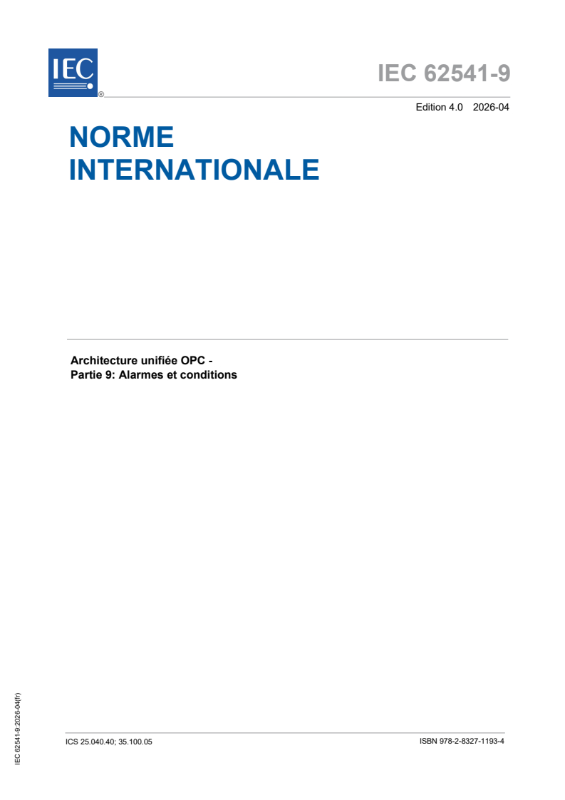 IEC 62541-9:2026 is a standard published by the International Electrotechnical Commission (IEC). Its full title is "OPC unified architecture - Part 9: Alarms and Conditions". This standard covers: IEC 62541-9:2026 specifies the representation of Alarms and Conditions in the OPC Unified Architecture. Included is the Information Model representation of Alarms and Conditions in the OPC UA address space. Other aspects of alarm systems like alarm philosophy, life cycle, alarm response times, alarm types and many other details are captured in standards such as IEC 62682 and ISA 18.2. The Alarms and Conditions Information Model in this document, is designed in accordance with IEC 62682 and ISA 18.2. Annex C specifies a recommended mapping between OPC Classic Alarm & Events (A&E) servers to the model described in this document. Annex A describes recommended localized names for Alarm states. Annex B describes examples (e.g. Event sequences, Alarm areas in AddressSpace). This fourth edition cancels and replaces the third edition published in 2020. This edition constitutes a technical revision. This edition includes the following significant technical changes with respect to the previous edition: a) addition of "Comment" parameter to Alarm shelving methods; b) addition of method that allows a client to get the members of a group, since it is possible that the AddressSpace does not expose instances of alarms; c) addition of deadband properties for all limits in the limit AlarmType (from which all other types described in this issue are derived); d) addition of text explaining the disabling of alarms is no longer supported in ISA 18.2 and that it is maintained in this document for backward compatibility, but that it is recommended that Alarm not be disabled; e) addition of optional severities for limit alarms; f) addition of new AlarmState variable type that can be used to collect alarm information for displays on graphics; g) addition of SupportsFilterRetain property to improve Client filtering; h) removal of ConditionSubClassId and ConditionSubClassNames from the conditiontype definition since they are now defined in BaseEventType.