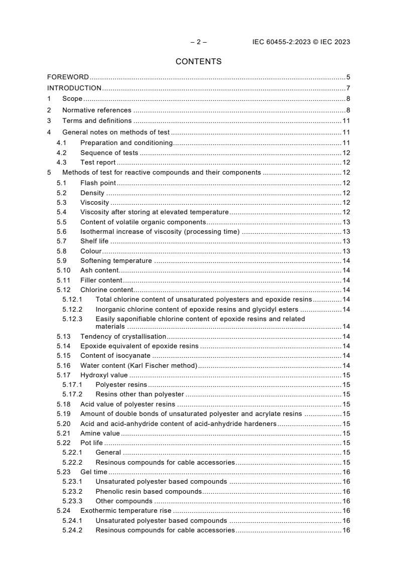 IEC 60455-2:2023 specifies methods of test to be used for testing resin based reactive compounds, their components and cured compounds used for electrical insulation. This fourth edition cancels and replaces the third edition published in 2015. This edition constitutes a technical revision. This edition includes the following significant technical changes with respect to the previous edition: a) Introduction of test methods related to IEC 60455-3-8; b) Additional and updated test methods for resins.