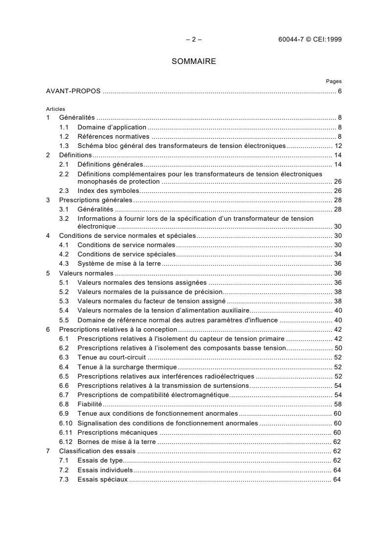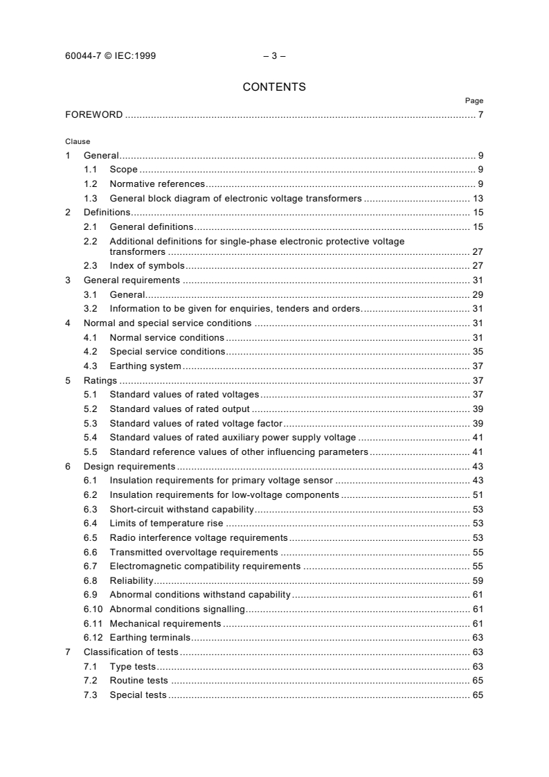 제목: IEC 60044-7:1999 - 계기 변압기 - 제7부: 전자 전압 변압기 내용: 이 기사는 주파수 범위가 15 Hz에서 100 Hz인 전기 측정기 및 전기 보호 장치와 함께 사용되는 아날로그 출력을 갖춘 새로 제작된 전자 전압 변압기에 적용된다. 이 표준은 전자 구성 요소를 갖춘 광학 배열을 다룬다. 3상 전압 변압기는 포함되지 않지만 일부 요구 사항이 적용된다.