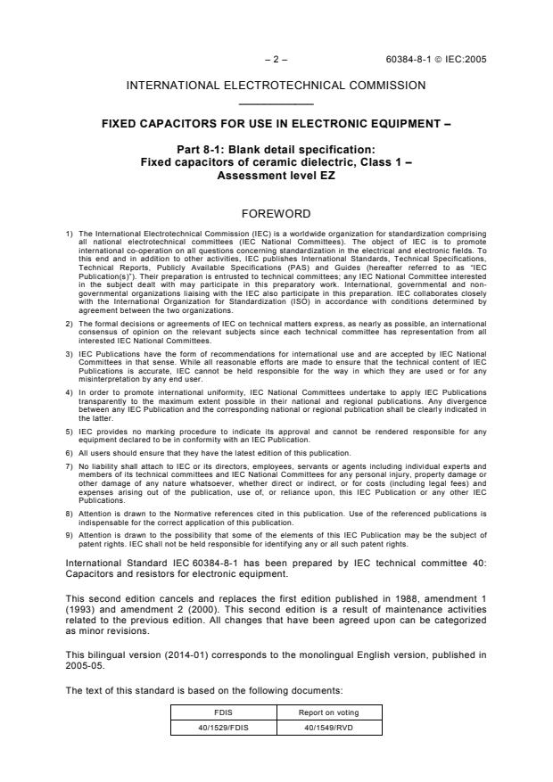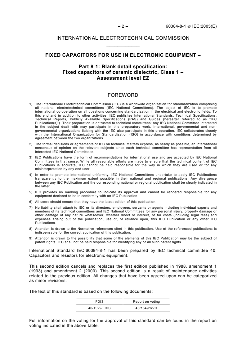 IEC 60384-8-1:2005 is the IEC blank detail specification for fixed capacitors of ceramic dielectric, Class 1, at assessment level EZ. It is a supplementary document to the sectional specification (IEC 60384-8) and defines the required style, layout and minimum content for manufacturer detail specifications. Detail specifications that do not follow this blank template may not be considered in accordance with IEC specifications. This second edition (2005) replaces the original edition and subsequent amendments with only minor revisions.