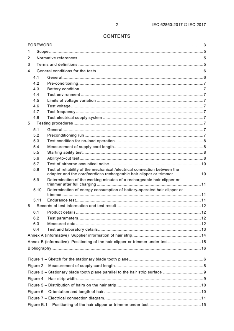 Keywords: IEC 62863:2017, electric hair clippers, trimmers, performance testing, household appliances, battery‑operated, rechargeable, ability‑to‑cut, noise test, endurance test.