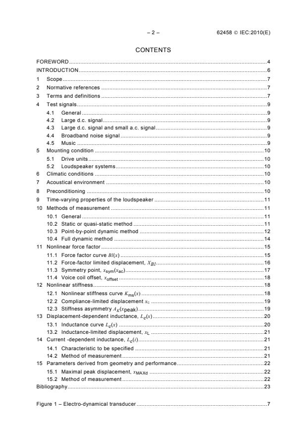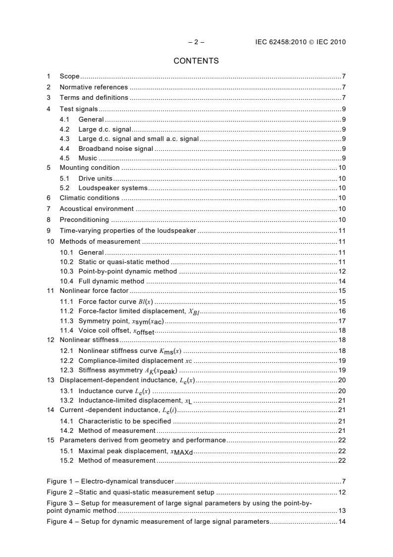 IEC 62458:2010은 스피커 드라이브 유닛, 헤드폰, 셰이커 등과 같은 음향 시스템에서 사용되는 평평기에 적용되는 표준이다. 이 표준은 큰 신호 파라미터를 측정하기 위해 전자 다이내믹 및 전자 자기 모터와 기계적 서스펜션을 결합시킨 트랜스듀서에 적용된다. 트랜스듀서의 대형 신호 동작은 힘 인자, 강성 및 인덕턴스와 같은 주요 비선형성을 고려한 집중 결로 모델에 의해 모델링된다. 이 표준은 모델의 기본 용어 및 매개 변수, 측정 방법 및 결과 보고 방식을 정의한다. 이는 2006년에 출판된 IEC/PAS 62458을 취소하고 대체한다. 주요 변경 사항은 다음과 같다: - 측정 방법에 대한 설명이 기술의 상태에 맞게 조정되었다. - 4장에서 15장까지 추가. - 부록 A가 표준의 본문에 통합되었다. - 총적인 문서 검토.