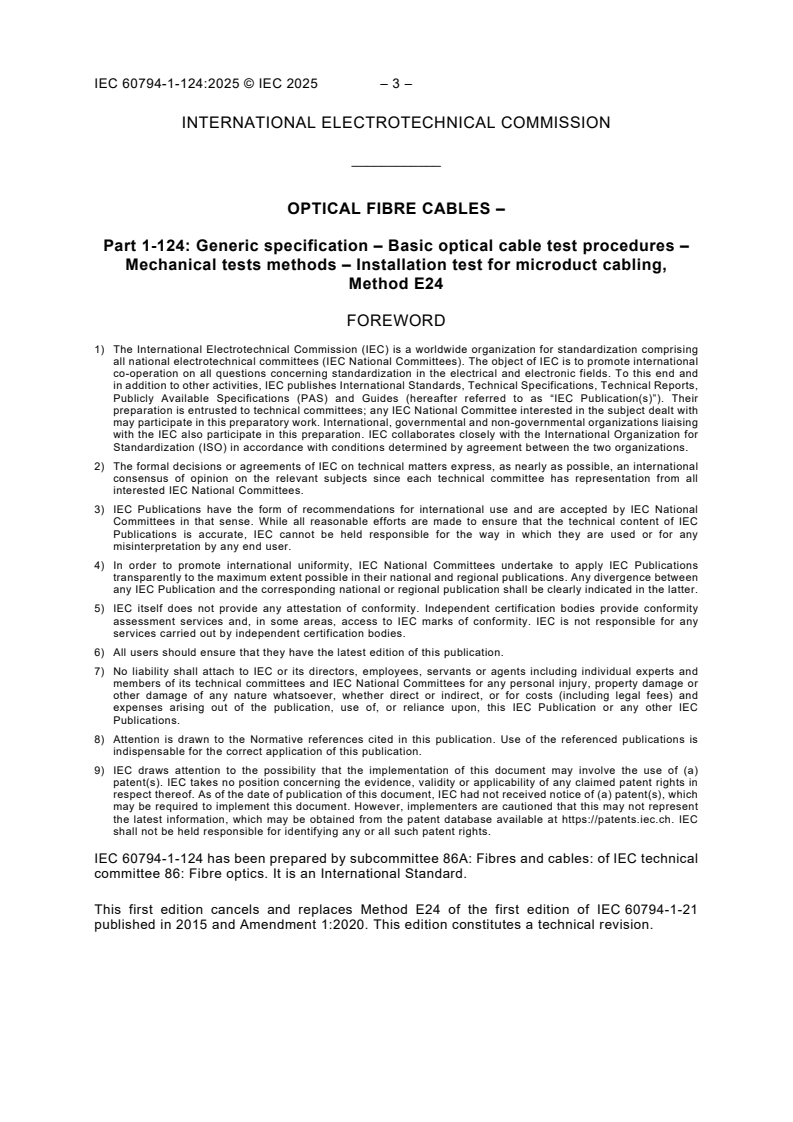 IEC 60794-1-124:2025 - Optical fibre cables - Part 1-124: Generic specification - Basic optical cable test procedures - Mechanical tests methods - Installation test for microduct cabling, Method E24 Released:5. 06. 2025 Isbn:9782832704578