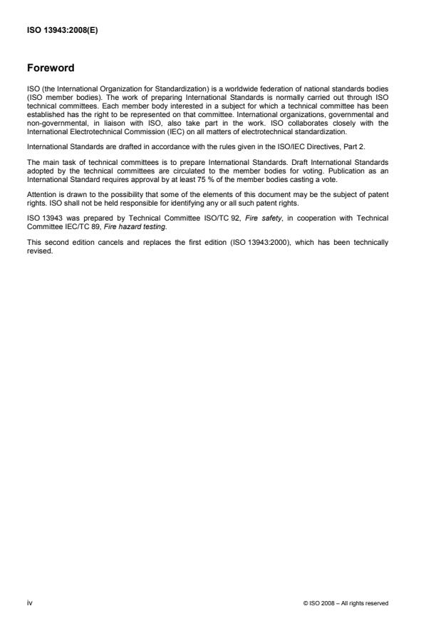 ISO 13943:2008 is a standard published by the International Electrotechnical Commission (IEC). Its full title is "Fire safety - Vocabulary". This standard covers: ISO 13943:2008 defines terminology relating to fire safety as used in International Standards and other documents of the International Standardization Organization and the International Electrotechnical Commission.