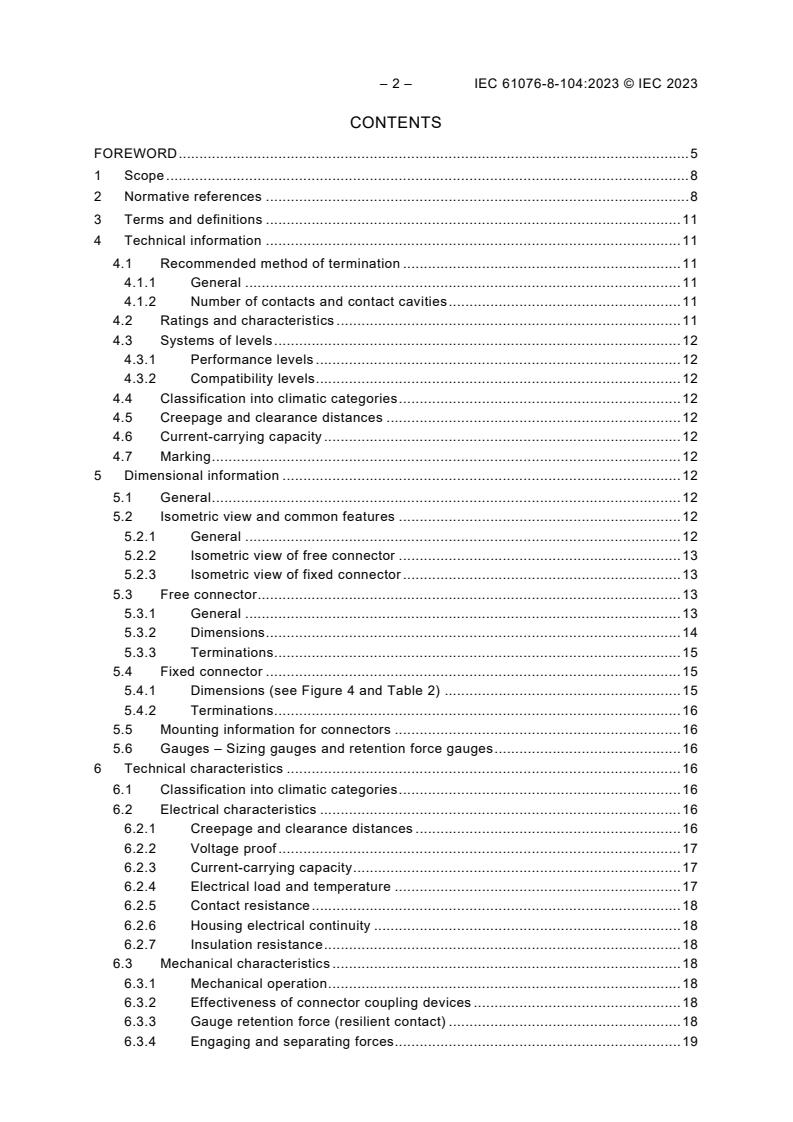 IEC 61076-8-104:2023 describes free and fixed 2-pole circular power connectors with 40 A rated current, rated voltage up to and including 50 V AC/DC, and push-pull locking IP65/IP67 metal housings (hereinafter referred to as connectors) for use in electrical and electronic equipment. It includes overall dimensions, interface dimensions, technical characteristics, performance requirements and test methods.