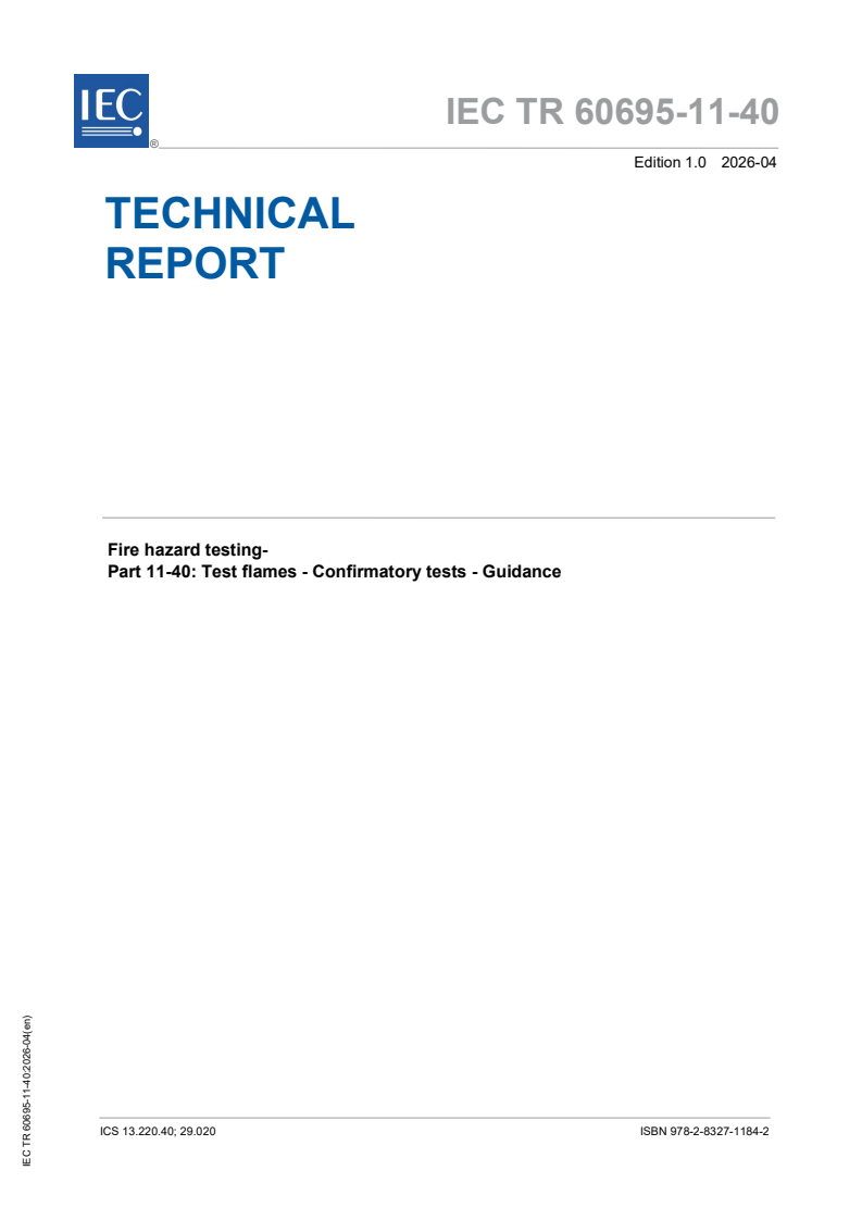 IEC TR 60695-11-40:2026 is a technical report published by the International Electrotechnical Commission (IEC). Its full title is "Fire hazard testing - Part 11-40: Test flames - Confirmatory tests - Guidance". This standard covers: IEC TR 60695-11-40:2026, presents a general characterization of small-scale test flames and associated confirmatory tests based on copper block calorimetry. Information is presented for the selection of critical parameters in confirmatory test designs. This basic safety publication is intended for use by technical committees in the preparation of safety publications in accordance with the principles laid down in IEC Guide 104 and ISO/IEC Guide 51. This first edition cancels and replaces the second edition of IEC TS 60695-11-40 published in 2021. This edition constitutes a technical revision. This edition includes the following significant technical changes with respect to the previous edition: a) change of classification of this document (from Technical Specification to Technical Report), based on the nature of this publication, which provides solely general information and the theoretical basis for confirmatory tests using copper blocks; b) minor editorial changes.