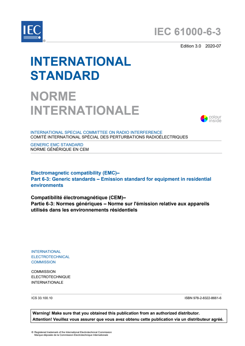 IEC 61000-6-3:2020 is a standard published by the International Electrotechnical Commission (IEC). Its full title is "Electromagnetic compatibility (EMC) - Part 6-3: Generic standards - Emission standard for equipment in residential environments". This standard covers: IEC 61000-6-3:2020 is a generic EMC emission standard applicable only if no relevant dedicated product or product family EMC emission standard has been published. This part of IEC 61000 for emission requirements applies to electrical and electronic equipment intended for use at residential (see 3.1.14) locations. This part of IEC 61000 also applies to electrical and electronic equipment intended for use at other locations that do not fall within the scope of IEC 61000-6-8 or IEC 61000-6-4. The intention is that all equipment used in the residential, commercial and light-industrial environments are covered by IEC 61000-6-3 or IEC 61000-6-8. If there is any doubt the requirements in IEC 61000-6-3 apply. The conducted and radiated emission requirements in the frequency range up to 400 GHz are considered essential and have been selected to provide an adequate level of protection of radio reception in the defined electromagnetic environment. Not all disturbance phenomena have been included for testing purposes but only those considered relevant for the equipment intended to operate within the locations included within this document. The emission requirements in this document are not intended to be applicable to the intentional transmissions and their harmonics from a radio transmitter as defined by the ITU. This third edition cancels and replaces the second edition published in 2006 and its Amendment 1:2010. This edition constitutes a technical revision. This edition includes the following significant technical changes with respect to the previous edition: a) alternative method for measuring conducted emissions on DC ports; b) limits and requirements applicable only to equipment intended to be used in residential locations; c) more stringent limits for DC power ports. NOTE 1 Safety considerations are not covered by this document. NOTE 2 In special cases, situations will arise where the levels specified in this document will not offer adequate protection; for example where a sensitive receiver is used in close proximity to an equipment. In these instances, special mitigation measures can be employed. NOTE 3 Disturbances generated in fault conditions of equipment are not covered by this document. NOTE 4 As the requirements in this document are more stringent or equivalent to those requirements in IEC 61000-6-4 and IEC 61000-6-8, equipment fulfilling the requirements of this document comply with the requirements of IEC 61000-6-4 and IEC 61000-6-8.