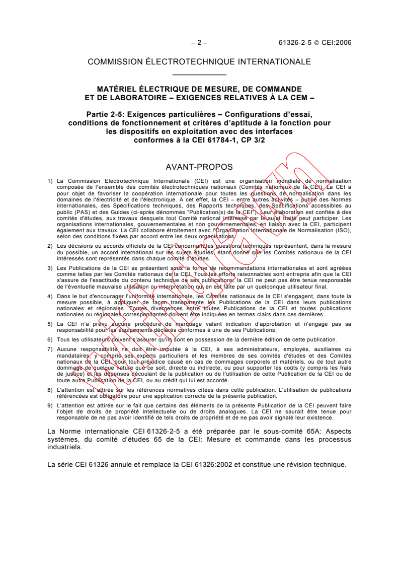 IEC 61326-2-5:2006 is a standard published by the International Electrotechnical Commission (IEC). Its full title is "Electrical equipment for measurement, control and laboratory use - EMC requirements - Part 2-5: Particular requirements - Test configurations, operational conditions and performance criteria for field devices with interfaces according to IEC 61784-1, CP 3/2". This standard covers: treats the particular features for EMC testing of field devices with interfaces according to IEC 61784-1, CP 3/2. This part of IEC 61326 covers only the field-bus interface of the equipment. traite les aspects particuliers des essais CEM pour les dispositifs ayant des interfaces conformes à la CEI 61784-1, CP 3/2.