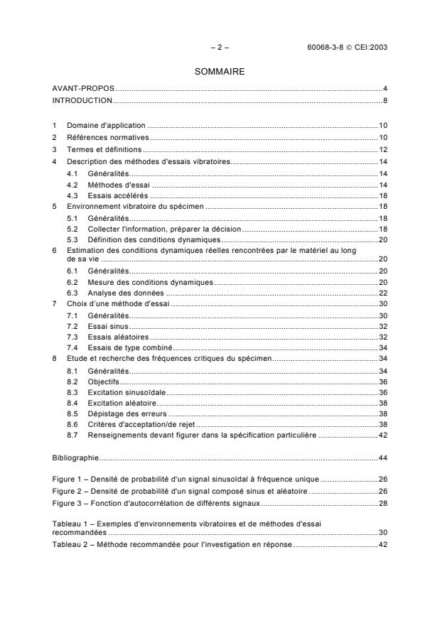 IEC 60068-3-8:2003 is a standard published by the International Electrotechnical Commission (IEC). Its full title is "Environmental testing - Part 3-8: Supporting documentation and guidance - Selecting amongst vibration tests". This standard covers: Provides guidance for selecting amongst the IEC 60068-2 stationary vibration test methods Fc sinusoidal, Fh random and F(x) Mixed mode vibration. The different steady-state test methods and their aims are briefly described in Clause 4. Transient test methods are not included. For vibration testing, the environmental conditions, especially the dynamic conditions for the specimen, should be known. This standard helps to collect information about the environmental conditions (Clause 5), to estimate or measure the dynamic conditions (Clause 6) and gives examples to enable decisions to be made on the most applicable environmental vibration test method. Starting from the condition, the method of selecting the appropriate test is given. Since real life vibration conditions are dominated by vibration of a random nature, random testing should be the commonly used method, see Table 1, Clause 7. The methods included hereafter may be used to examine the vibration response of a specimen under test before, during and after vibration testing. The selection for the appropriate excitation method is described in Clause 8 and tabulated in Table 2. In this standard specification, writers will find information concerning vibration test methods and guidance for their selection. For guidance on test parameters, or severities of one of the test methods, reference should be made to the normative references.