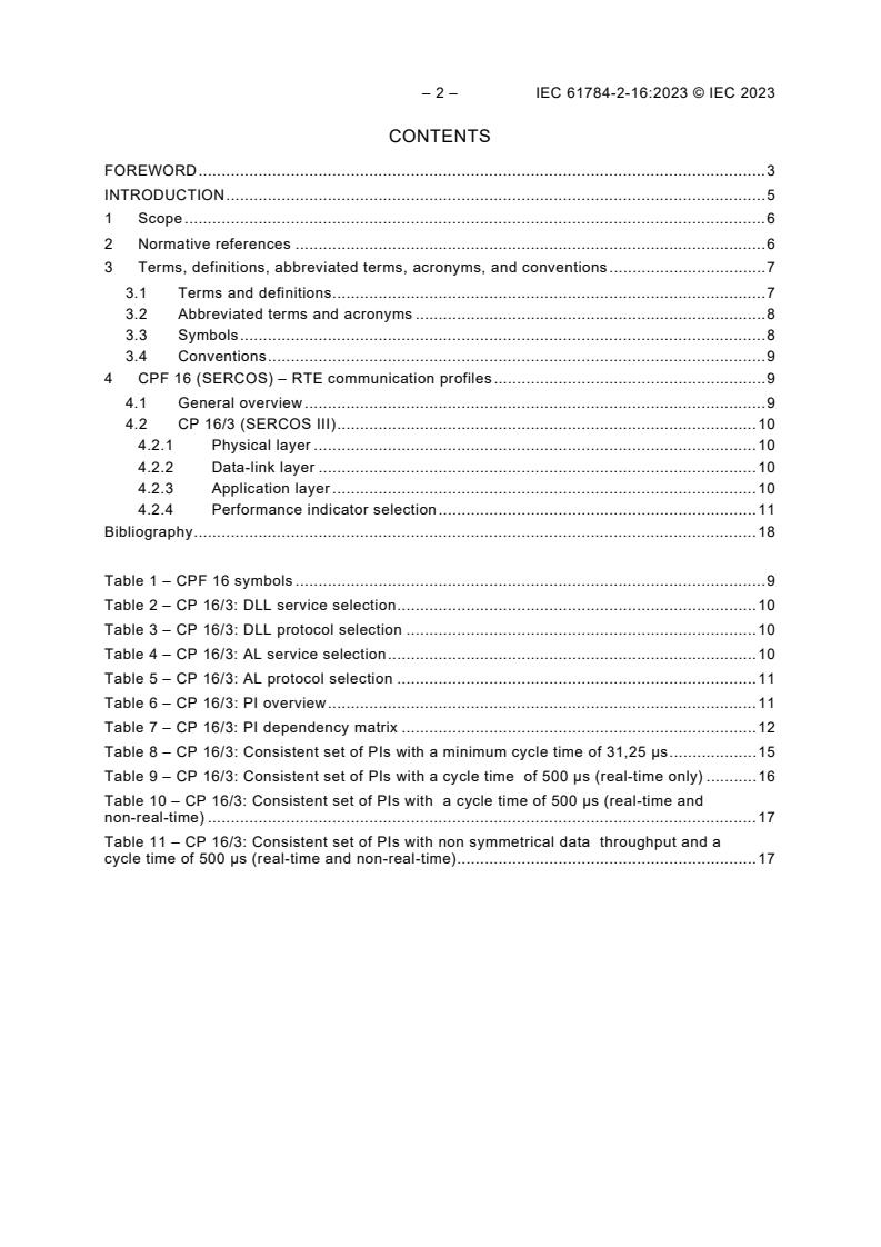 IEC 61784-2-16:2023 defines extensions of Communication Profile Family 16 (CPF 16) for Real-Time Ethernet (RTE). CPF 16 specifies a Real-Time Ethernet (RTE) communication profile (CP) and related network components based on the IEC 61158 series (Type 19), ISO/IEC/IEEE 8802-3 and other standards. For each RTE communication profile, this document also specifies the relevant RTE performance indicators and the dependencies between these RTE performance indicators. NOTE 1 All CPs are based on standards or draft standards or International Standards published by the IEC or on standards or International Standards established by other standards bodies or open standards processes. NOTE 2 The RTE communication profile uses ISO/IEC/IEEE 8802-3 communication networks and its related network components and in some cases amend those standards to obtain RTE features. NOTE 3 Some CPs of CPF 16 are specified in IEC 61784-1-16.