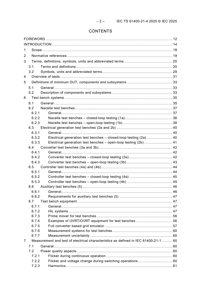 IEC TS 61400-21-4:2025 specifies a uniform methodology, defining measurement, testing and assessment procedures of electrical characteristics of wind turbine components and subsystems, as basis for the verification of the electrical capabilities of wind turbines and wind turbine families. This document includes the following aspects: - definitions of test bench, subsystems and interface; - definitions of system requirements for the test bench to perform relevant measurements (grid strengths, short circuit power, THD, …); - measurement procedures for quantifying the electrical characteristics; - test and measurement procedures for verifying and validating the electrical characteristics of components and subsystems in relation to grid compliance requirements; - procedures for the transferability of the component and subsystem test results, measured at the test bench, to WT product families; - documentation requirements and validation procedures of components, subsystems and wind turbines. The results of the measurements and assessments of the wind turbine components and subsystems will be used as input for the verification of electrical capabilities as described in IEC 61400-21-1 and for the validation and verification of the electrical simulation models for wind power plants (WPP) as described in IEC 61400-27.