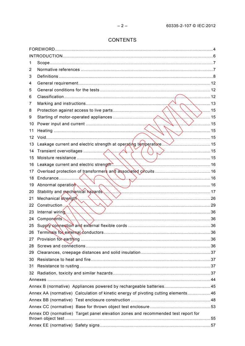 IEC 60335-2-107:2012 is an international standard developed by the International Electrotechnical Commission (IEC) that specifies safety requirements for robotic battery powered electrical lawnmowers with a rated battery voltage of up to 75 V d.c. These lawnmowers are charged via mains electrical power and/or solar power. This standard focuses exclusively on robotic rotary lawnmowers used in domestic or similar environments and excludes non-robotic machines such as lawn trimmers, lawn edgers, ride-on and pedestrian lawnmowers. IEC 60335-2-107:2012 complements the basic safety requirements outlined in IEC 60335-1:2001 and covers hazards typical of battery-operated robotic lawnmowers, excluding electromagnetic compatibility (EMC) and environmental hazards except for noise.