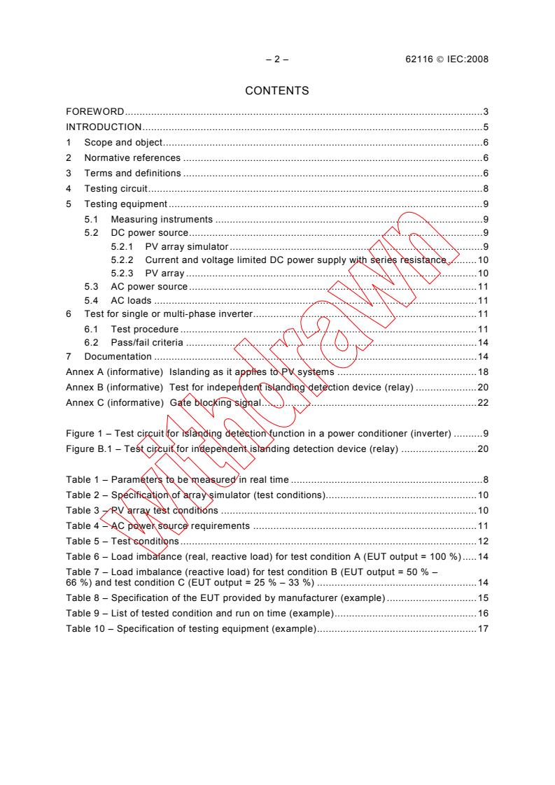 IEC 62116:2008 describes a guideline for testing the performance of automatic islanding prevention measures installed in or with single or multi-phase utility interactive PV inverters connected to the utility grid. The test procedure and criteria described are minimum requirements that will allow repeatability. Additional requirements or more stringent criteria may be specified if demonstrable risk can be shown. Inverters and other devices meeting the requirements of this standard are considered non-islanding as defined in IEC 61727.